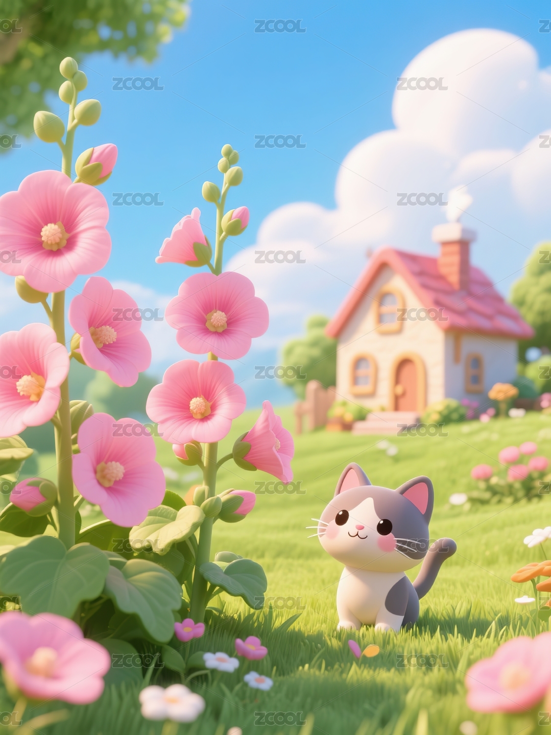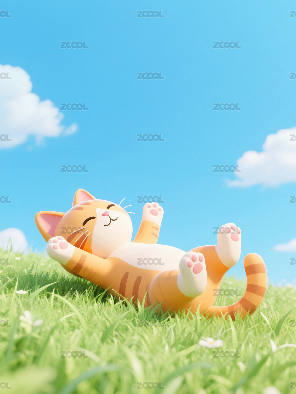 白天晴天绿色原野尖耳朵猫3D立体卡通插画