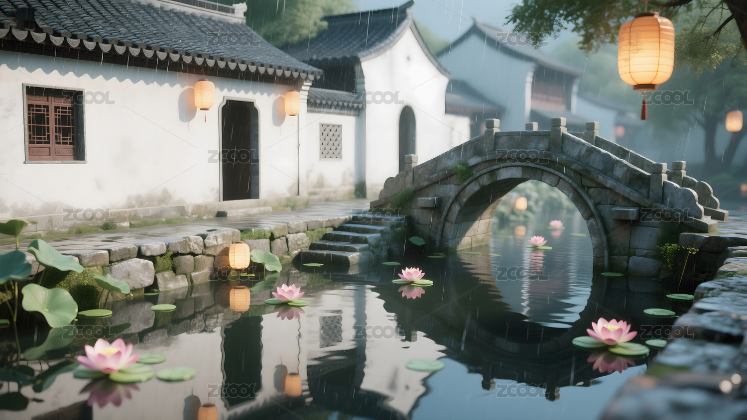 小镇,雨天,石板路,房屋,小桥,柳树,花,风景,春天