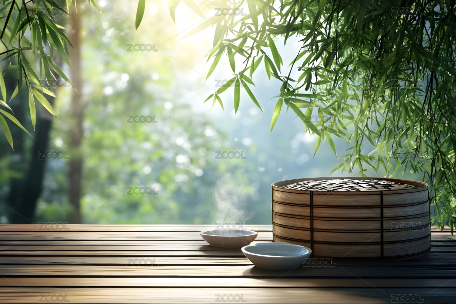 传统竹叶粽与竹制餐具的静物摆拍