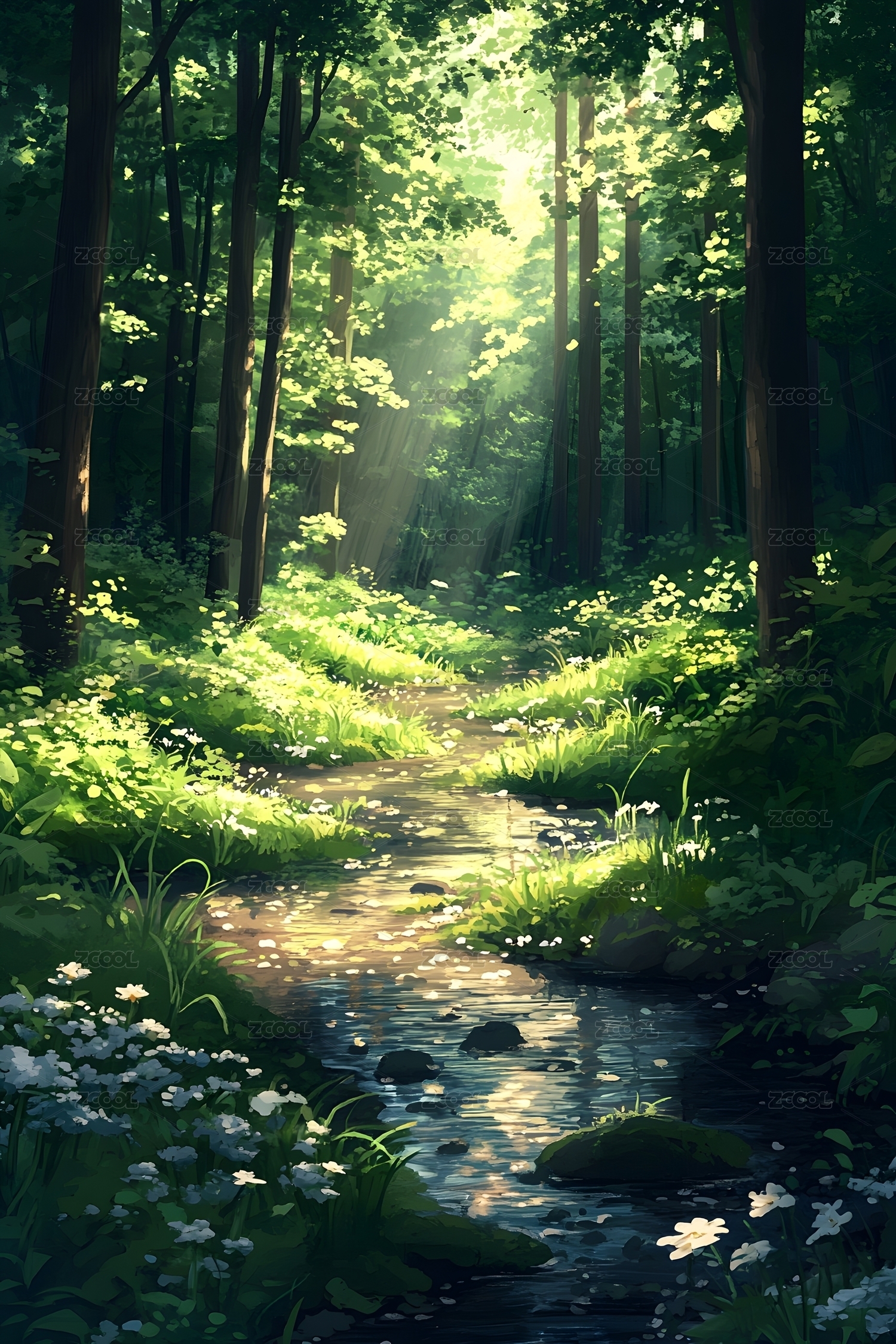 夏日森林中的阳光与溪流