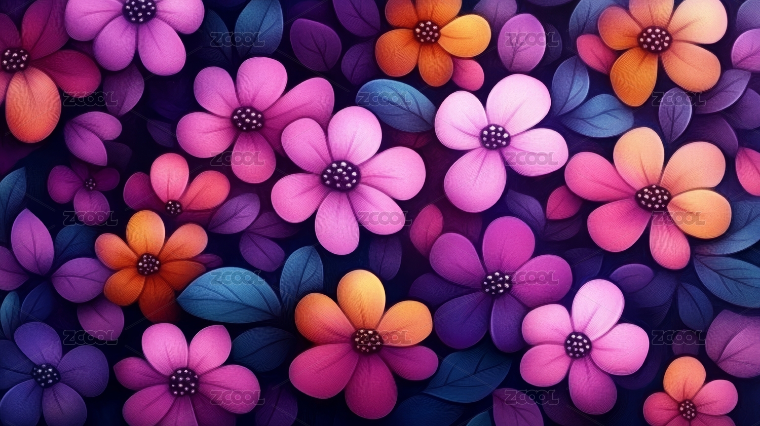 花卉,花朵,粉色,紫色,蓝色,玫红,金黄,叶子,图案,刺绣