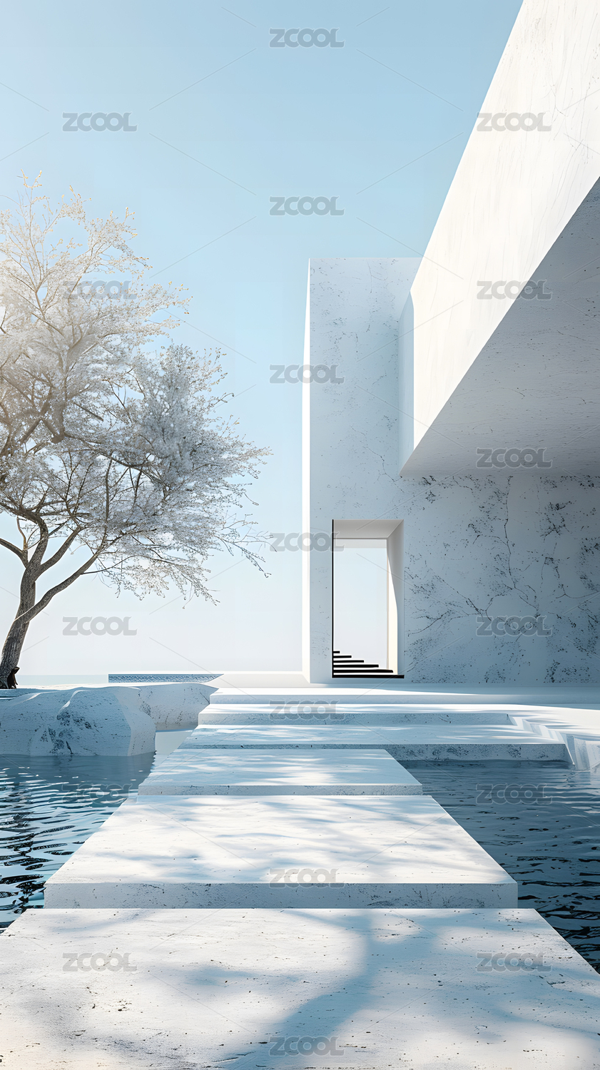 现代简约风格白色建筑与游泳池
