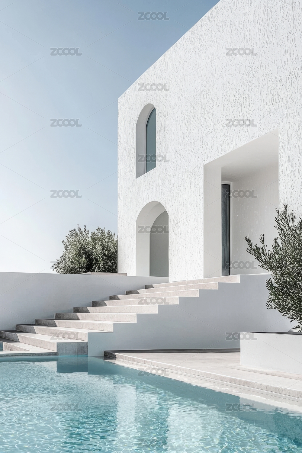 现代白色建筑楼梯与泳池