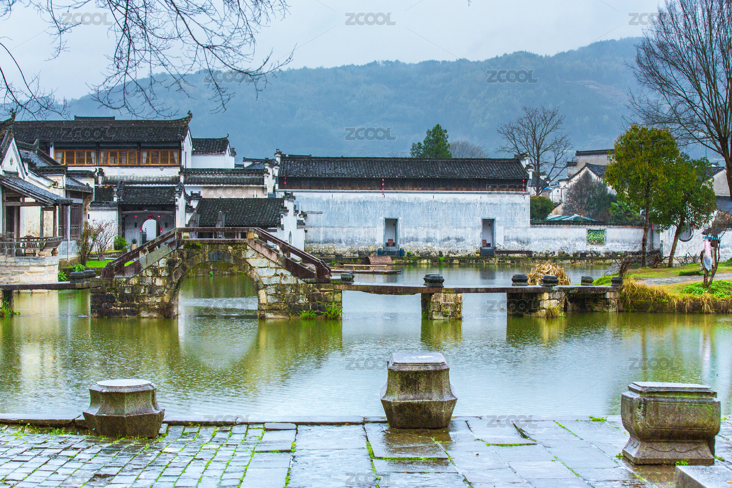 雨雾中的安徽省黄山市徽州区呈坎古镇景观