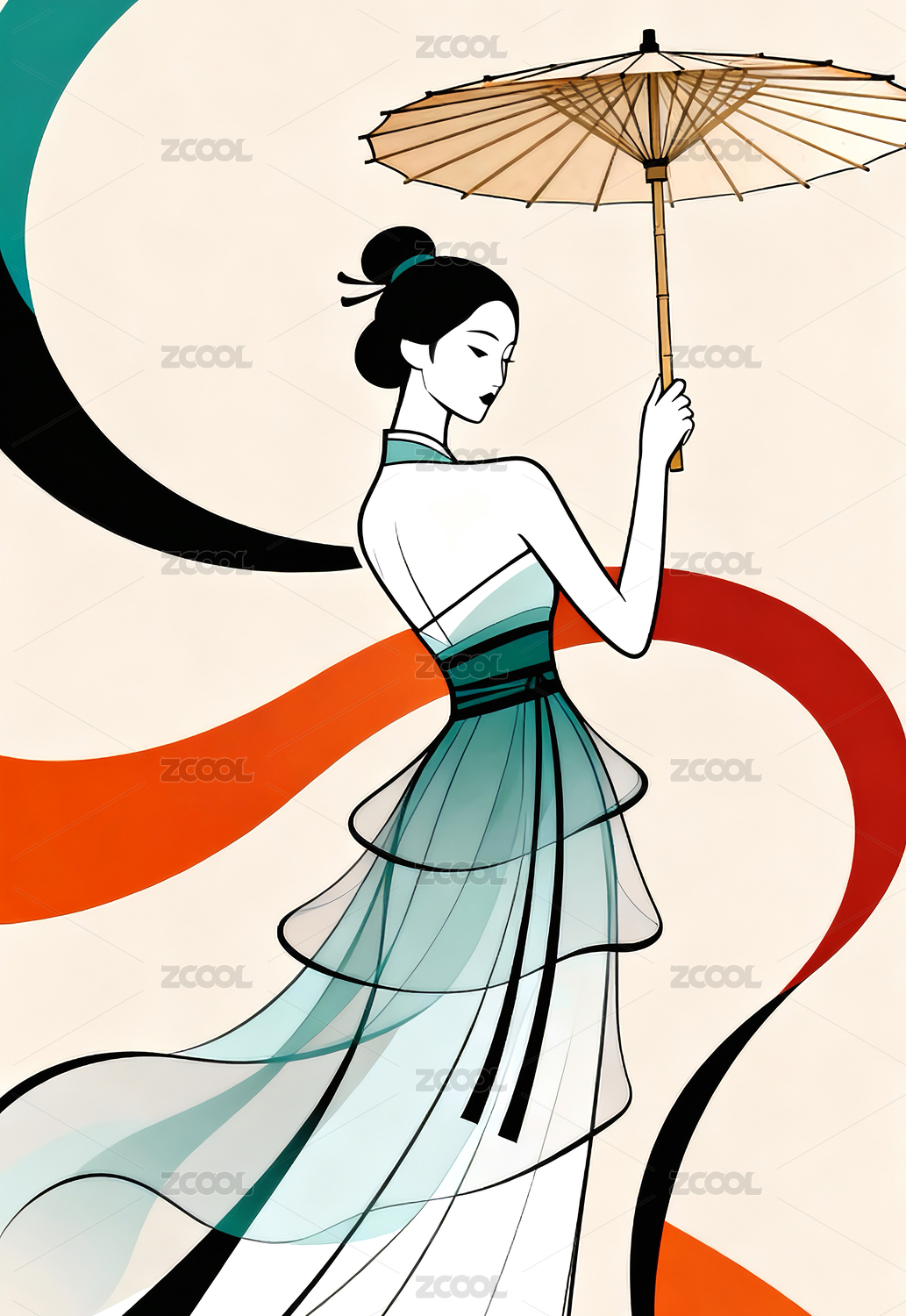 女性,插画,旗袍,珍珠,耳环,发饰,茶杯,热气,雨伞,花朵