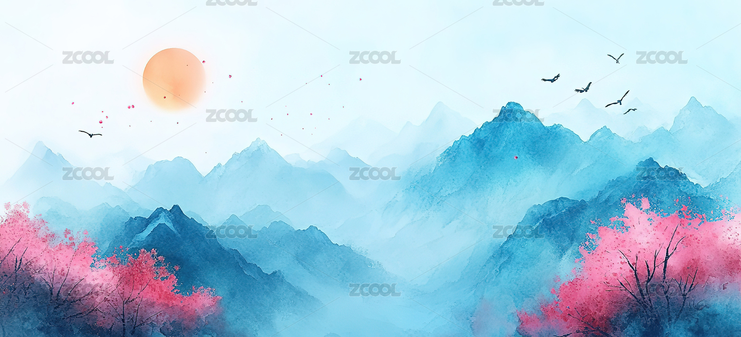 山峦,远山,近山,桃花,霞光,落日,飞鸟,云雾,水墨,意境