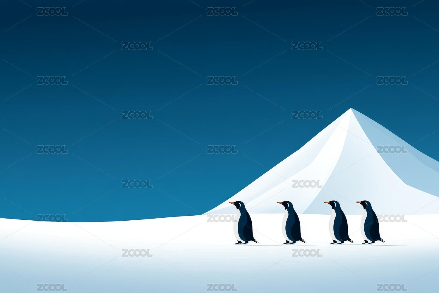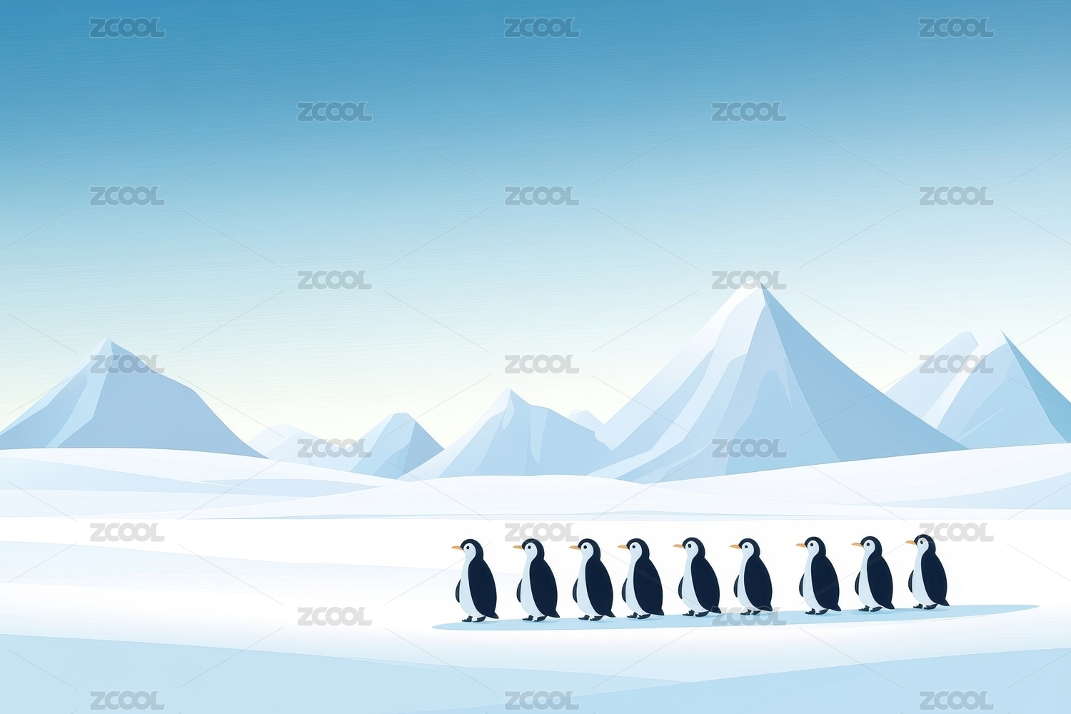 企鹅队伍冰雪远山