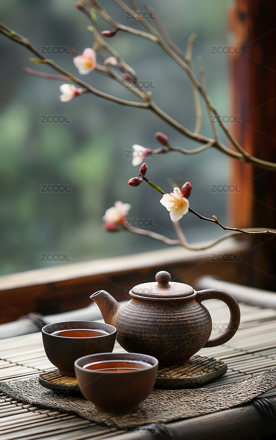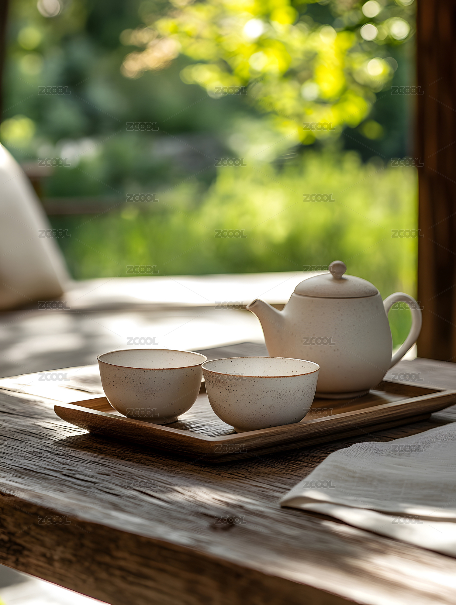 木桌茶具伴窗外绿意景致