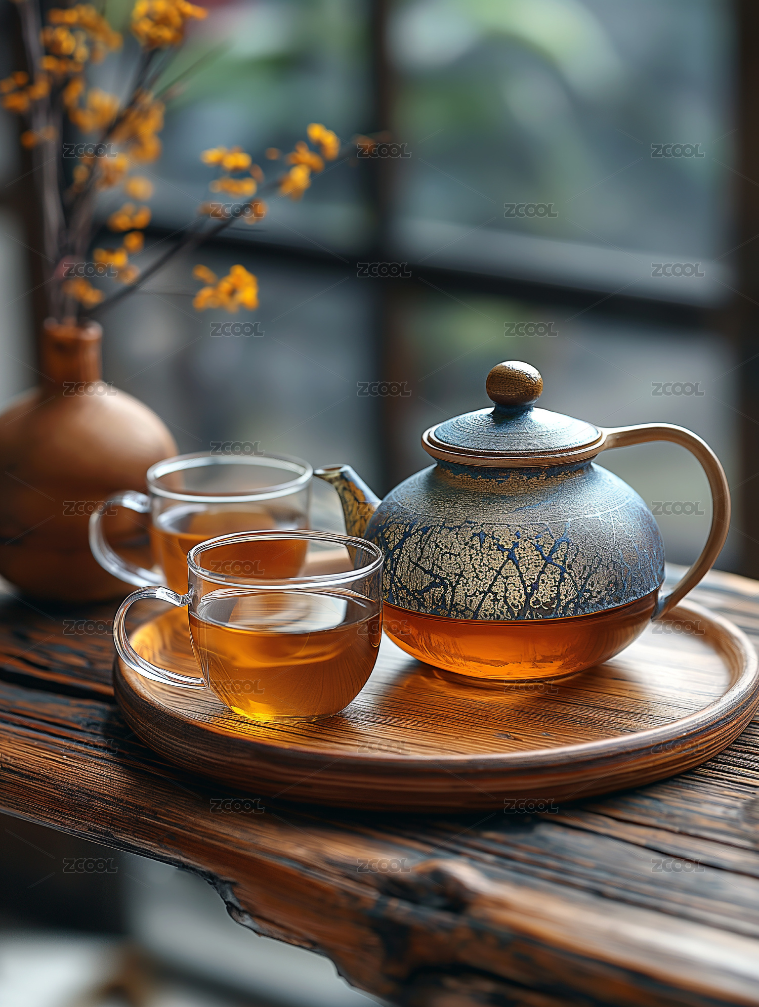 森林为背景的桌面上放置的紫砂茶具和花瓶