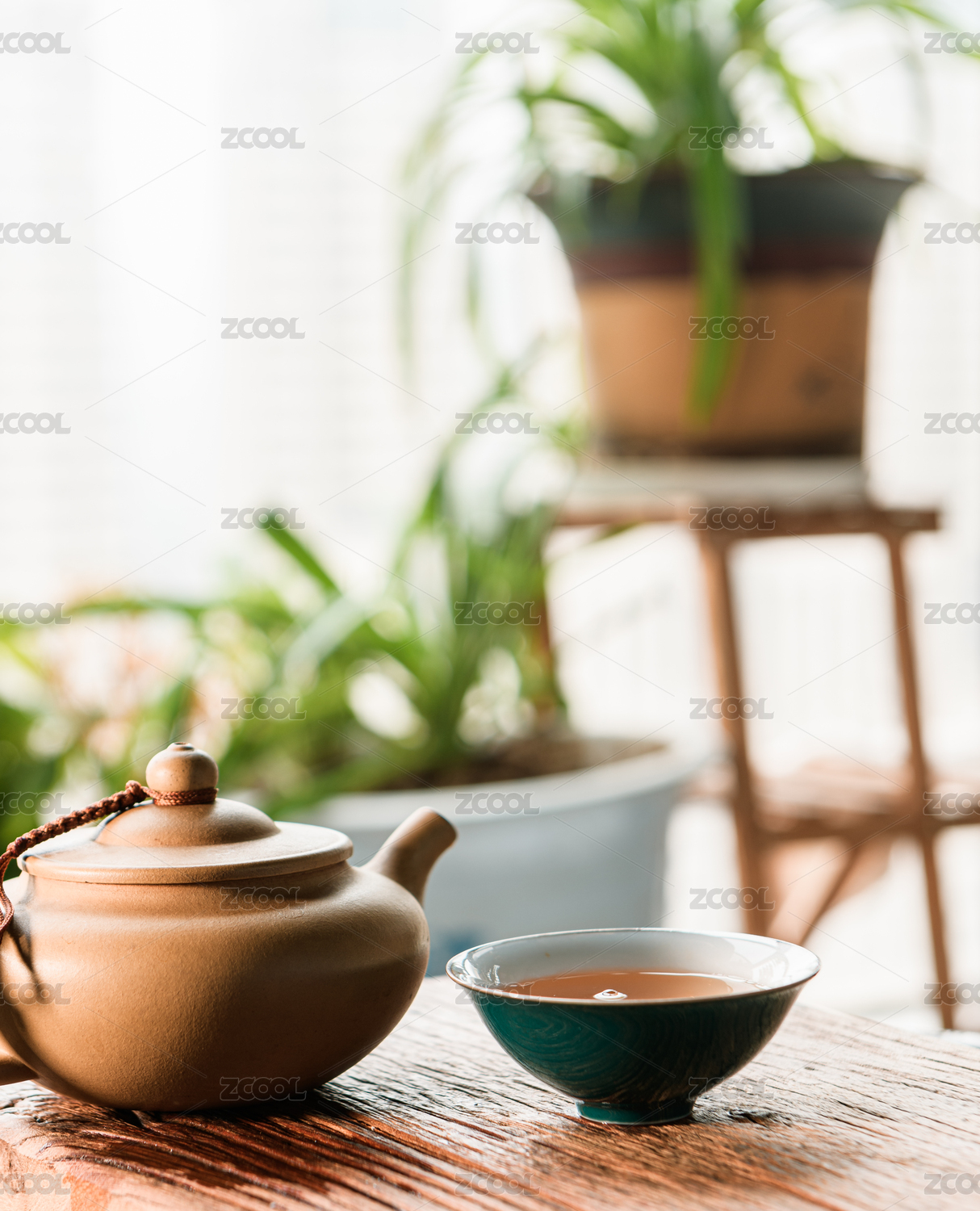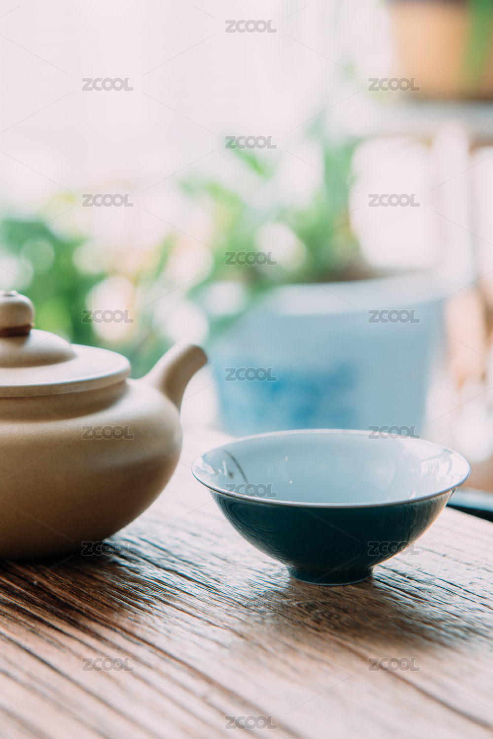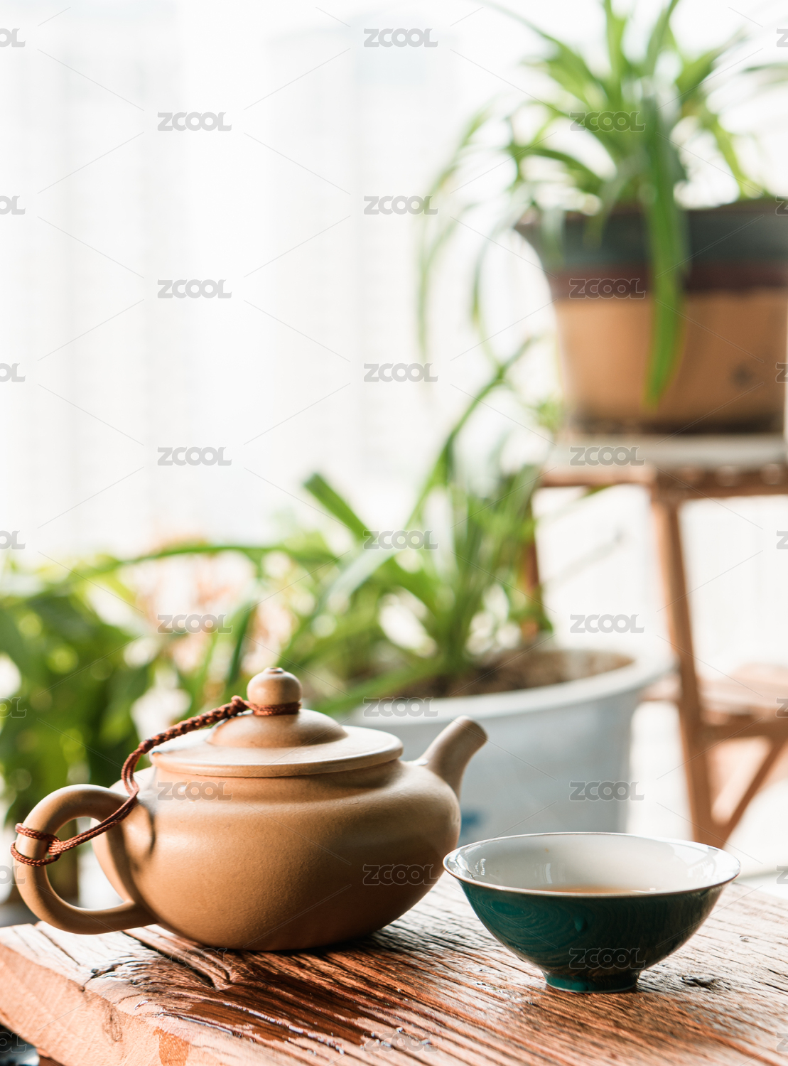 木桌上的茶壶与茶杯