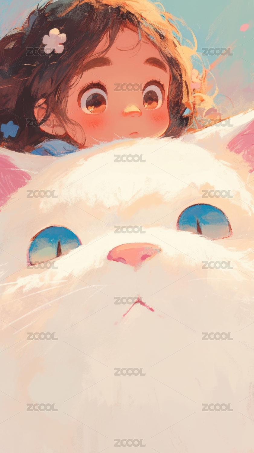 梦幻唯美猫咪和女孩在草坪上睡觉的手机插画