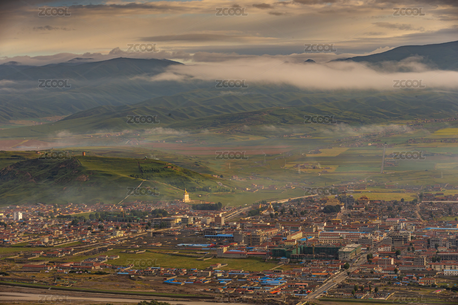 城镇,山脉,黄昏,全景,建筑,草地,自然景观,平原,四川,甘孜