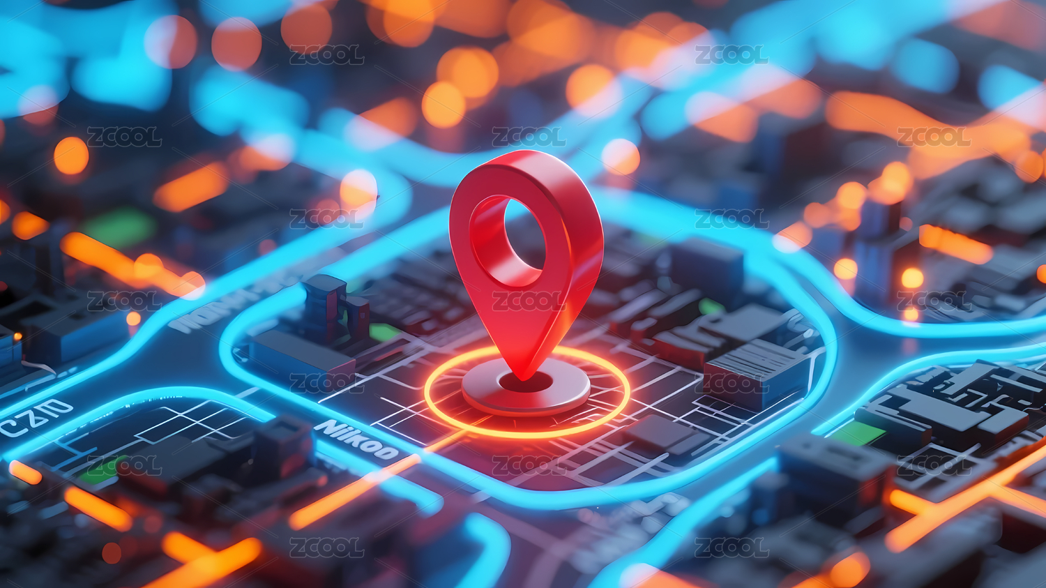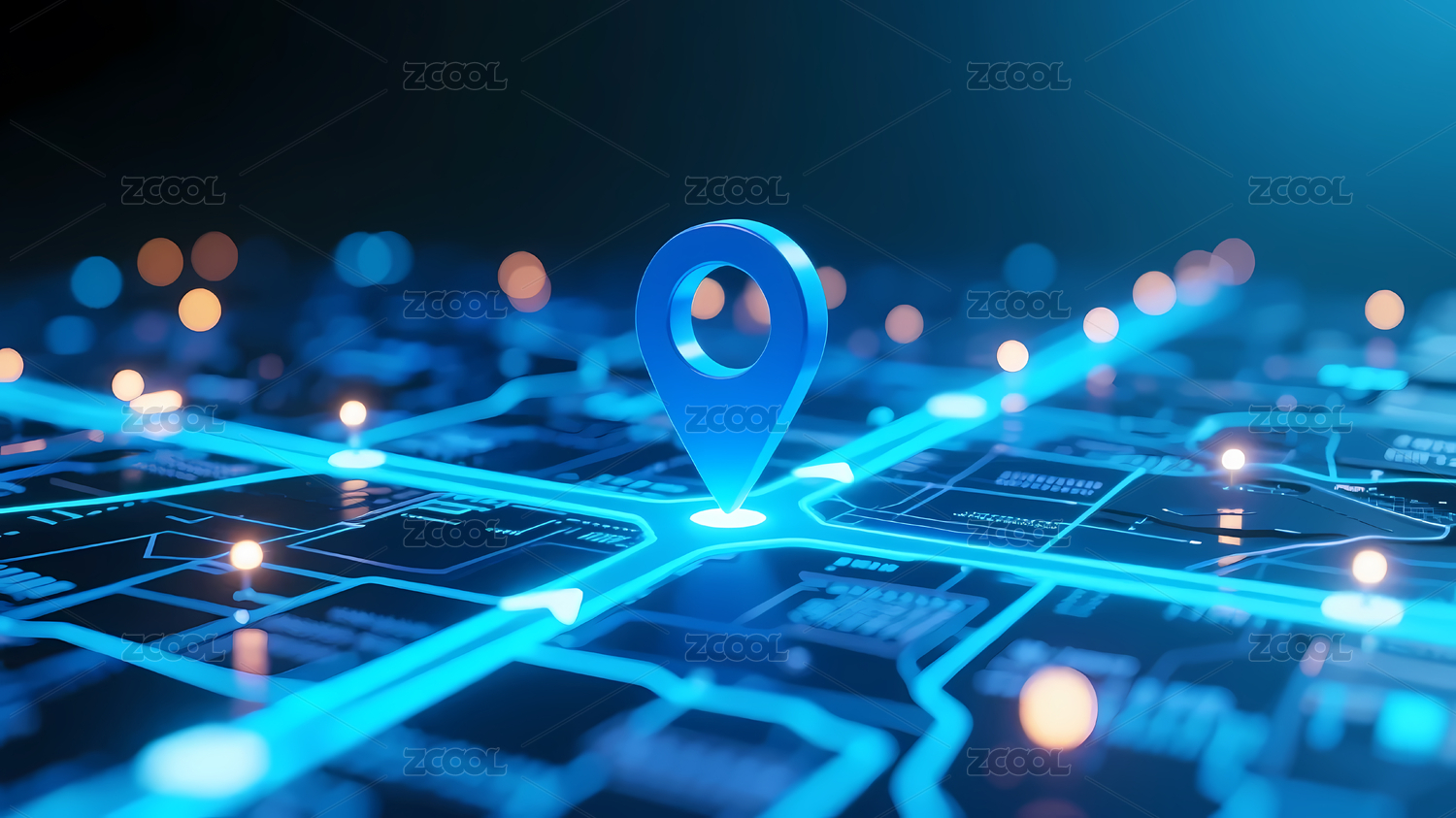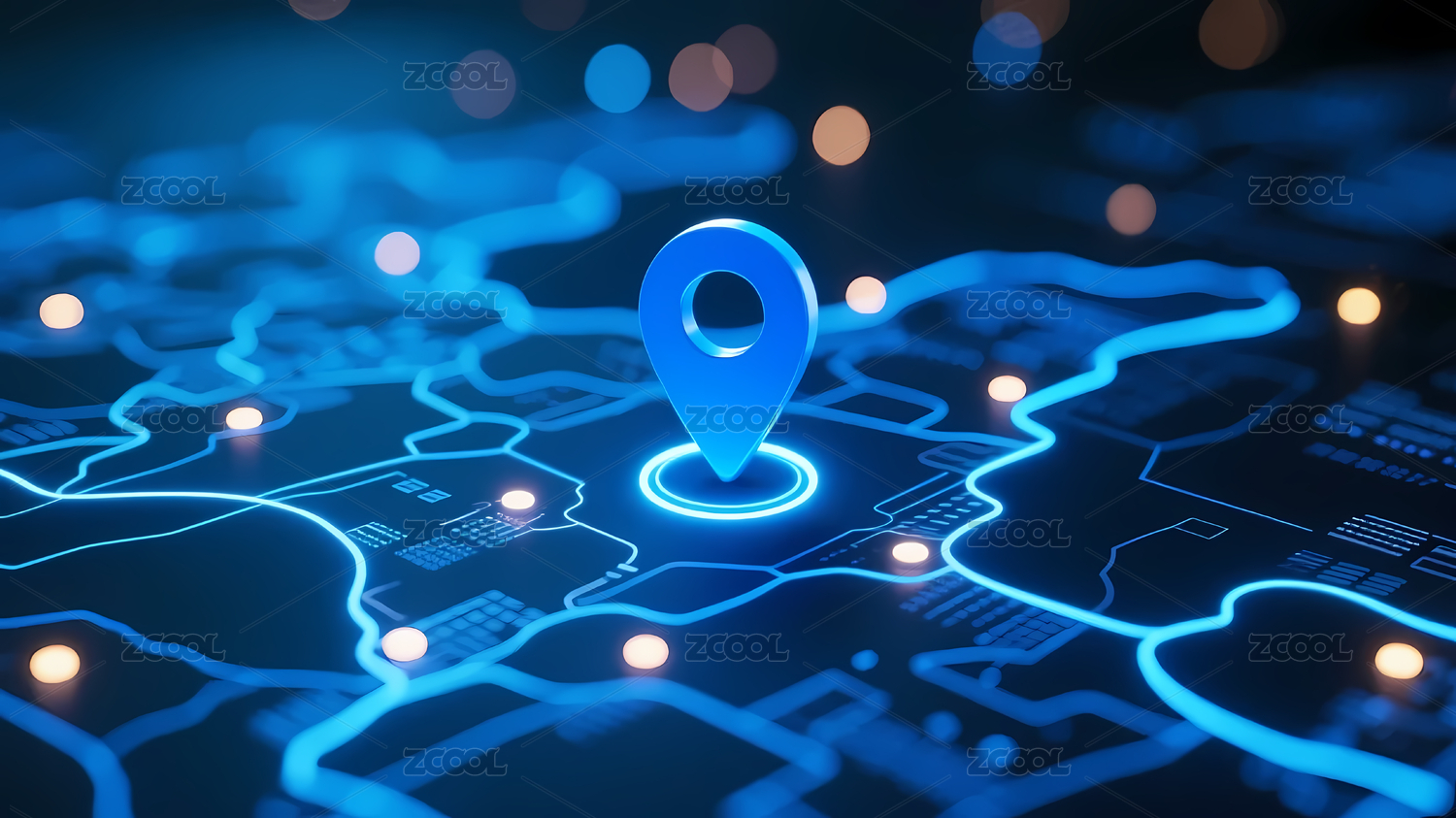 蓝色位置标记图标位于城市街道的鸟瞰图上