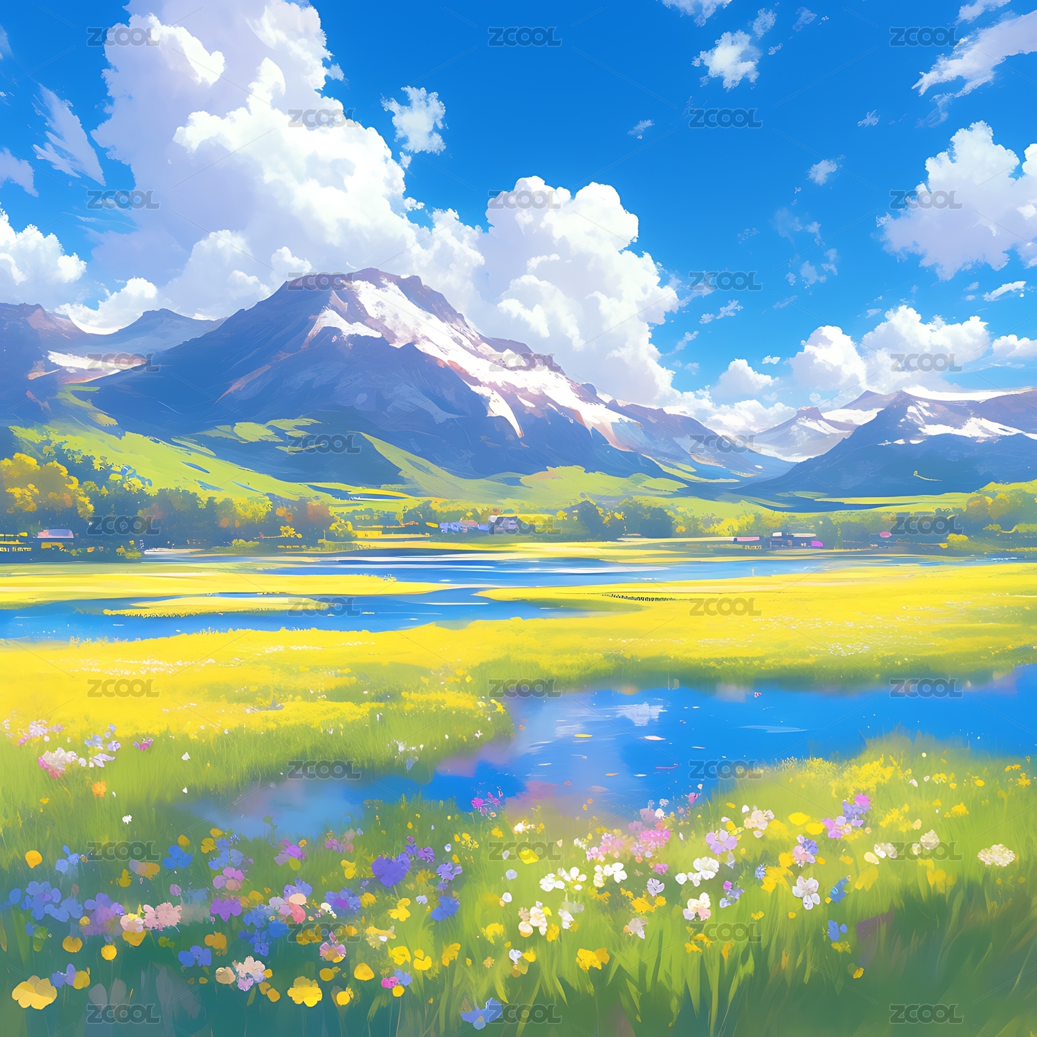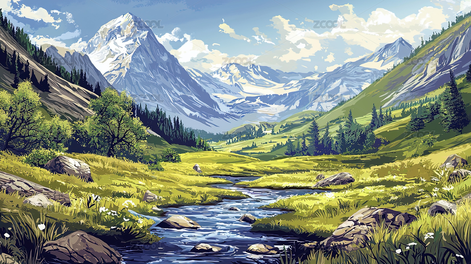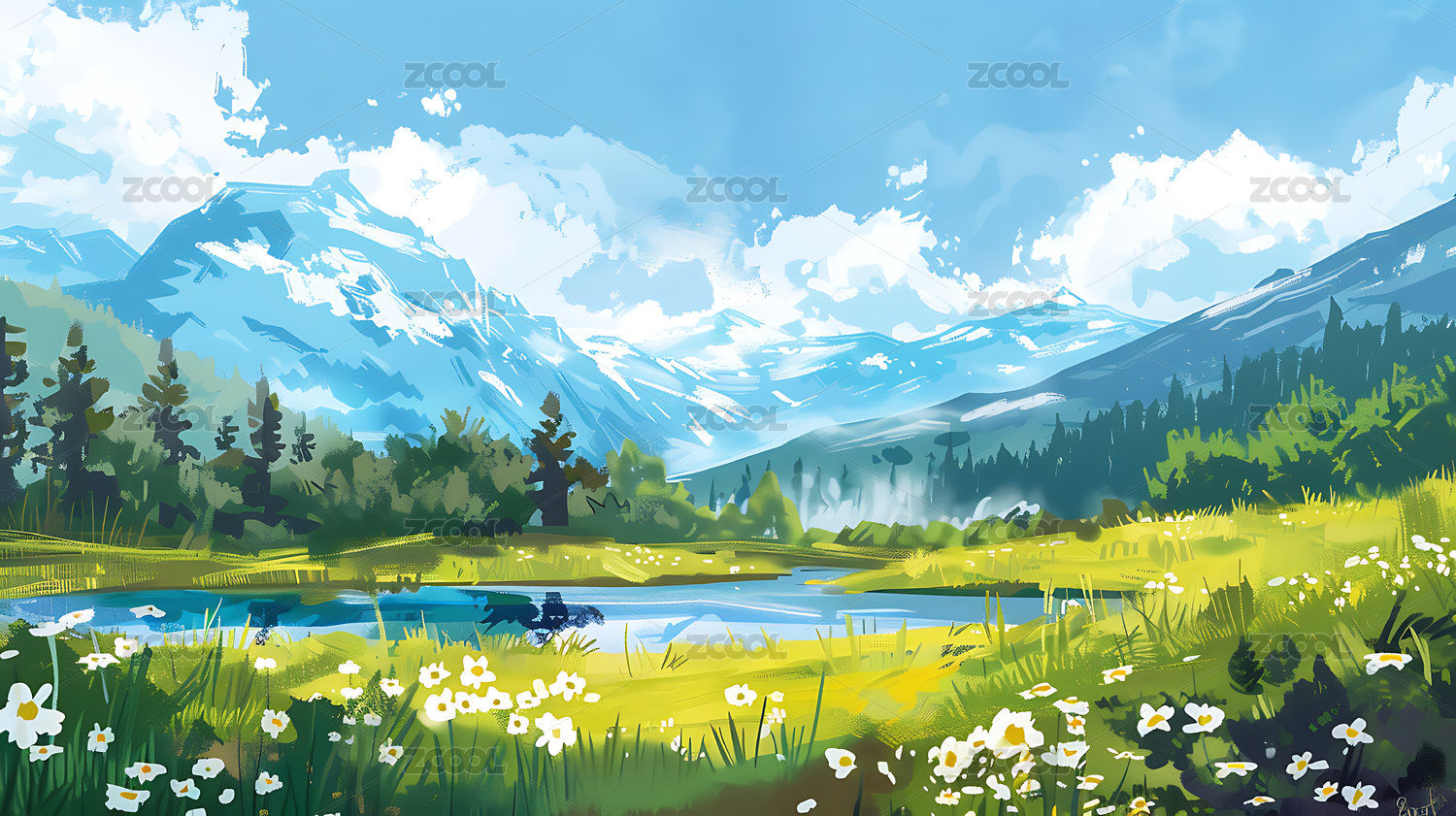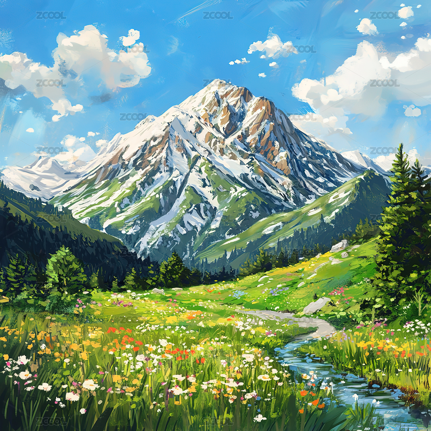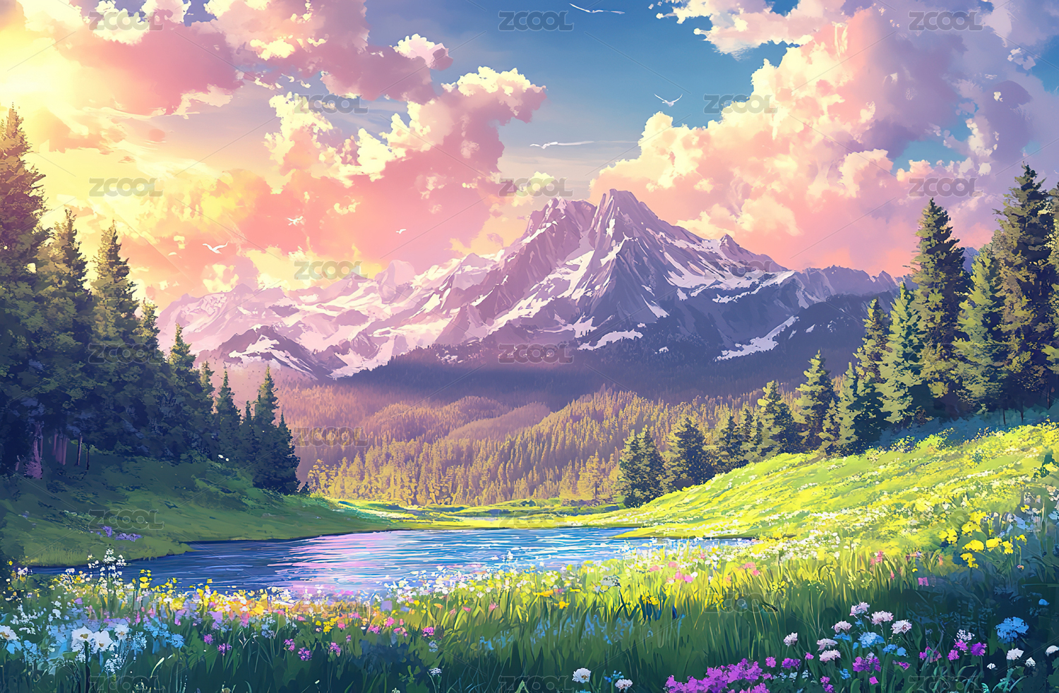 蓝色,粉色,天空,鲜花,树木,雪山,风景,绿色,阿尔卑斯山,山脉