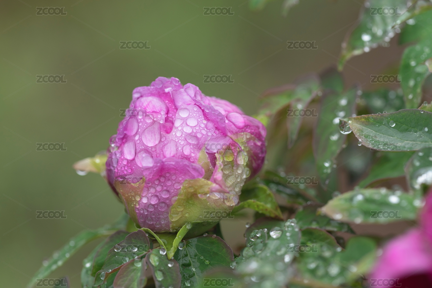 春雨中,盛开的粉色花瓣的山茶花的特写