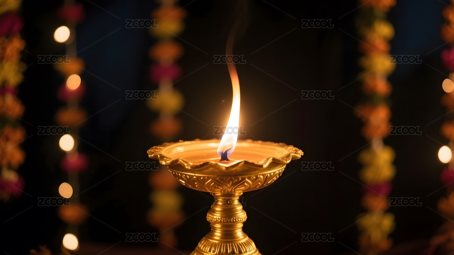 一盏装饰精美的黄铜油灯,火焰摇曳