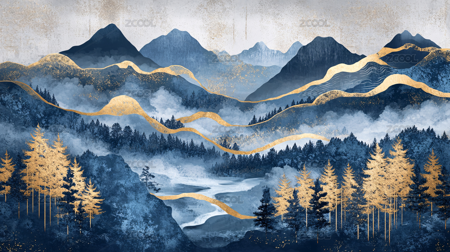蓝色,自然,抽象,河流,山脉,树木,风景,艺术,金色,水彩