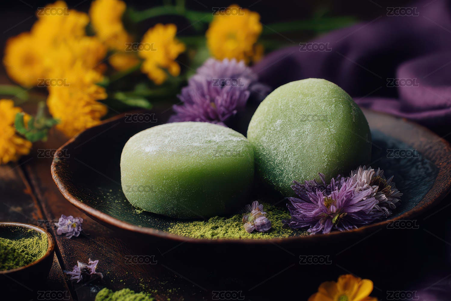抹茶甜点与花卉装饰的雅致组合
