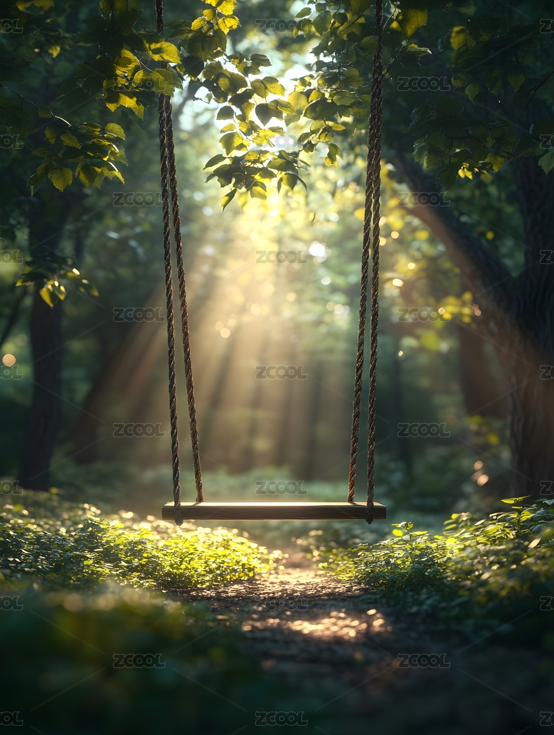 阳光洒在森林秋千上