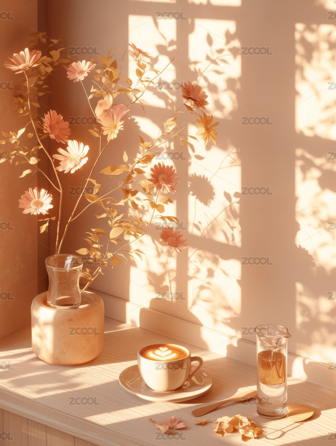 阳光下的花与咖啡