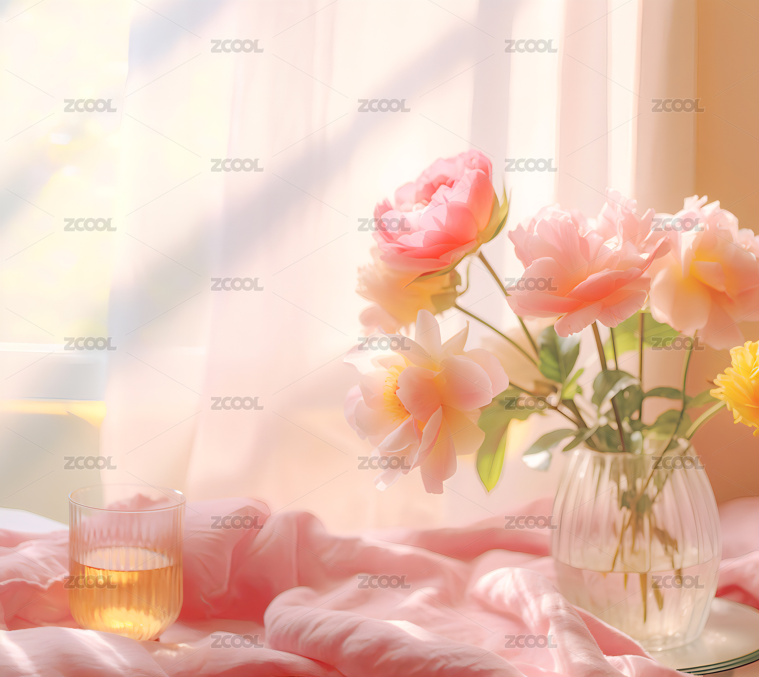 阳光照射在窗前的花瓶上