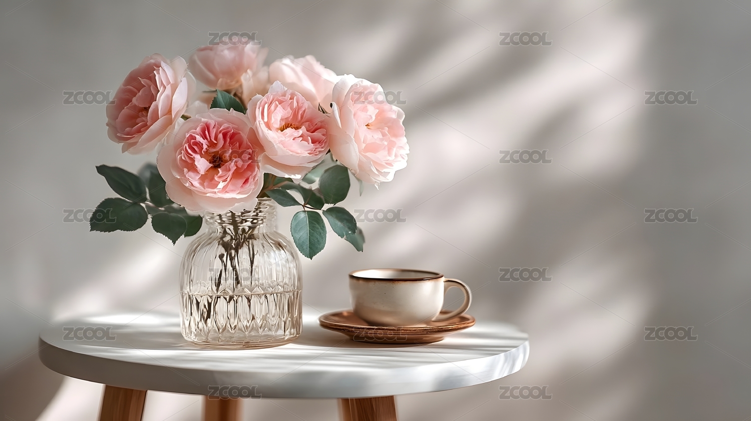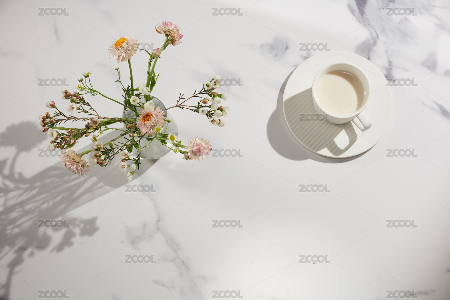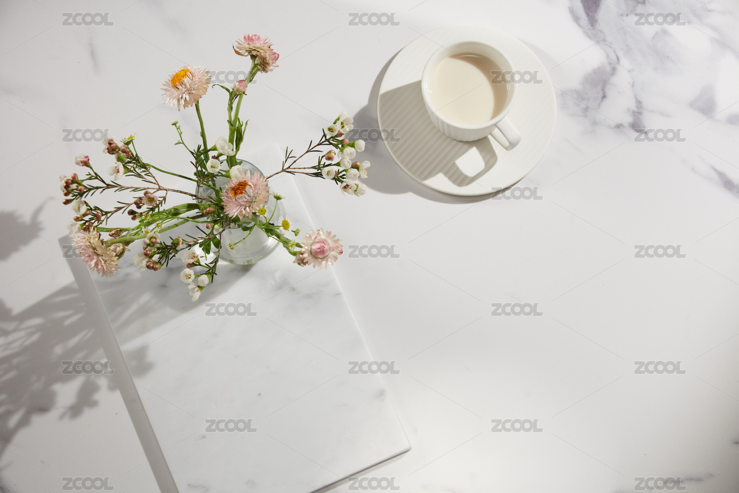 放有鲜花的大理石桌面
