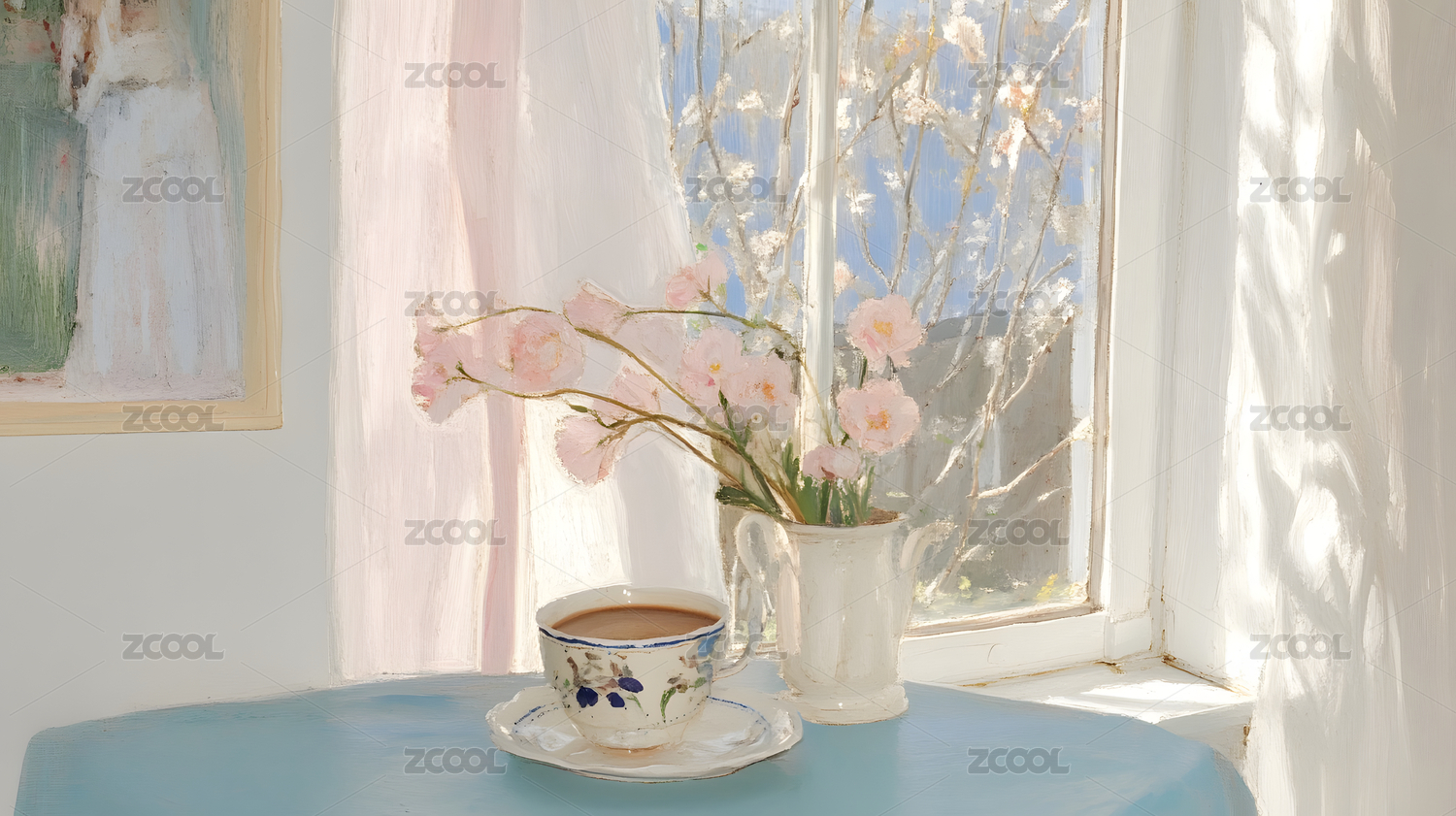 唯美窗台上的花瓶和咖啡杯