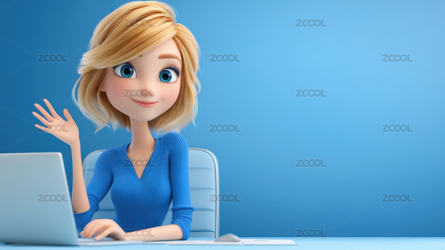 笑容,蓝色,可爱,女孩,麦克风,卡通,主持,节目,西装,发型