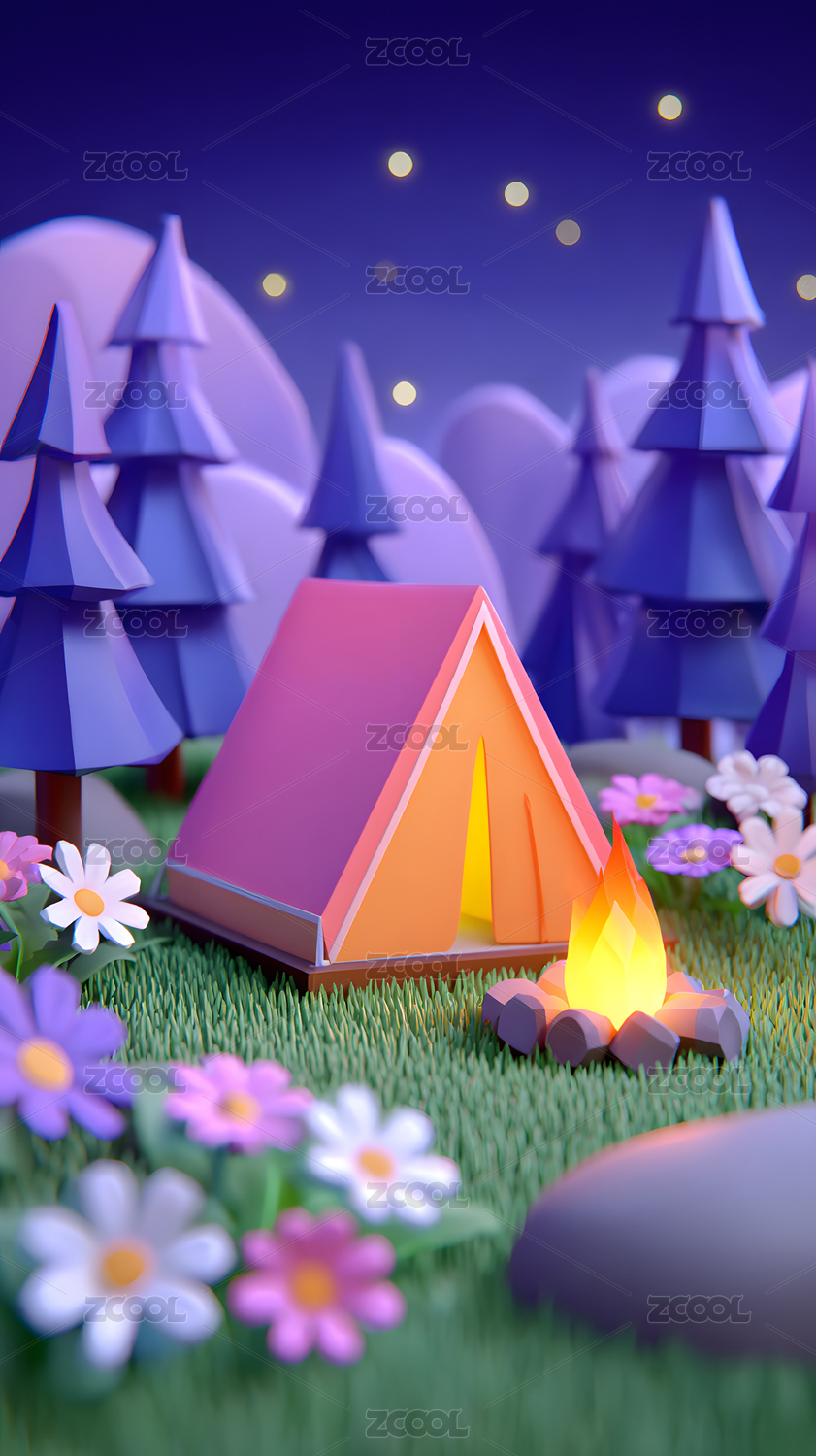 夜晚野营帐篷三维插画,户外旅行露营野营星