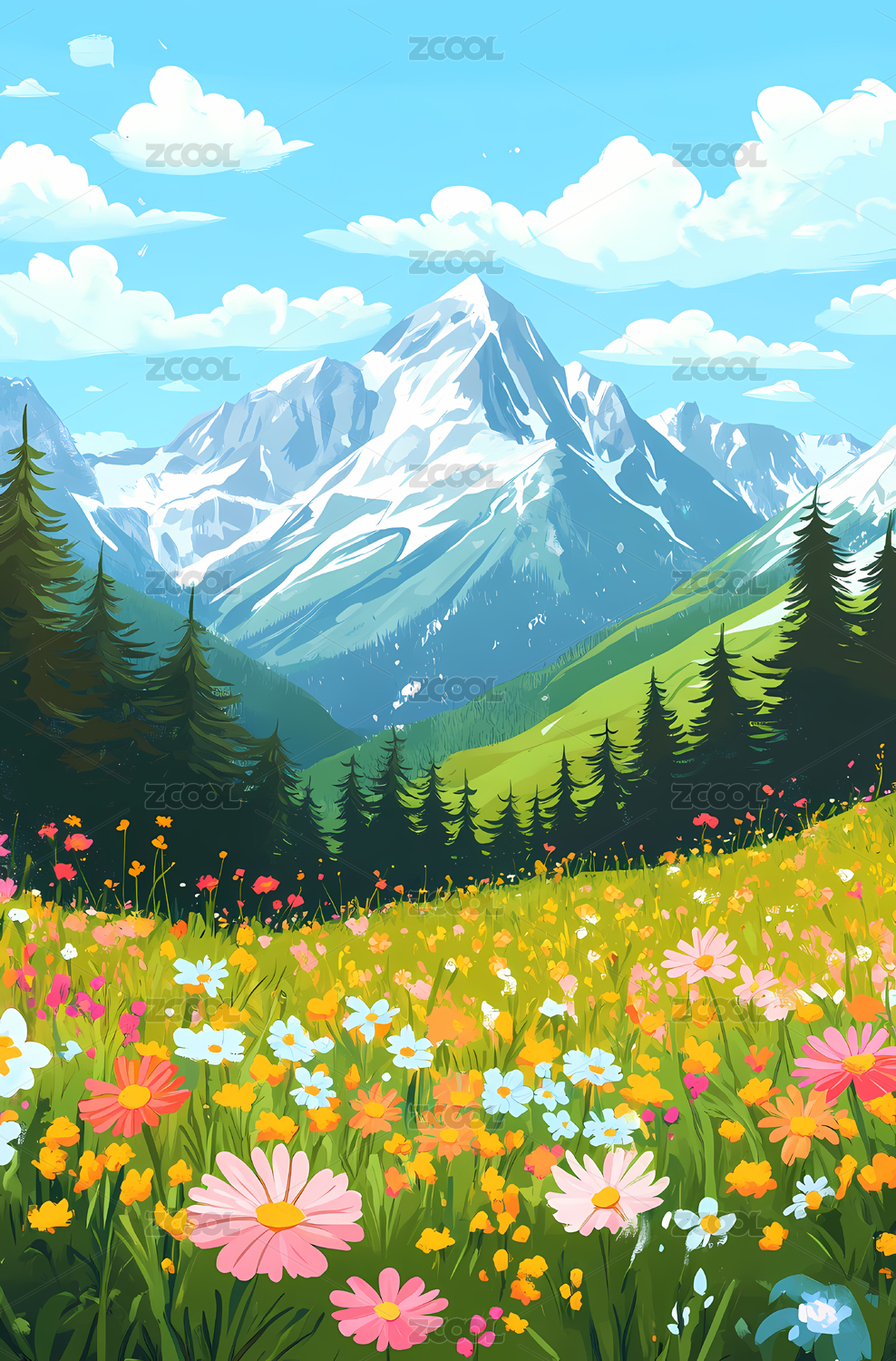 雪山下的草原小花风景背景