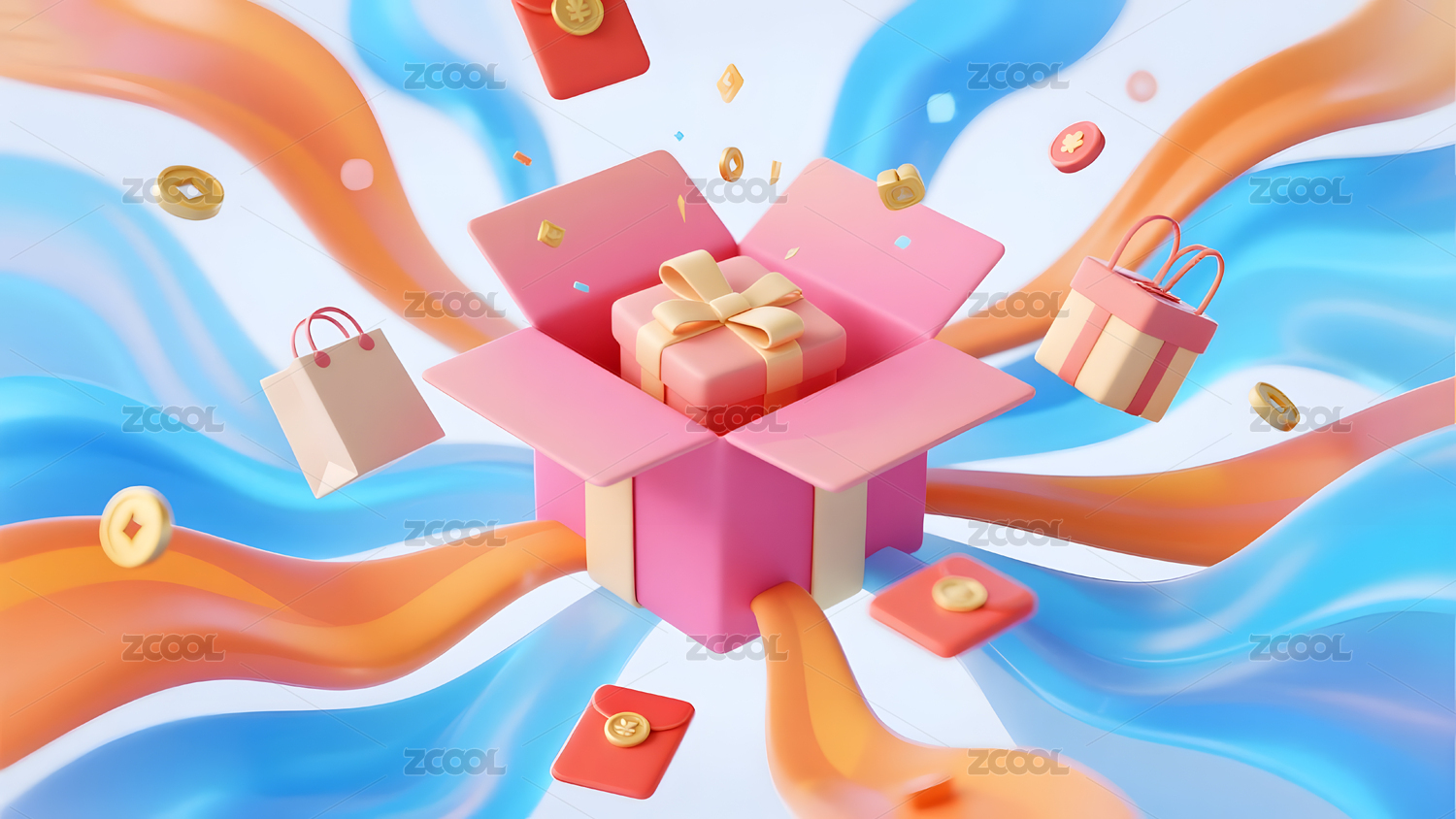 清新可爱金色丝带的礼盒3D卡通立体插画