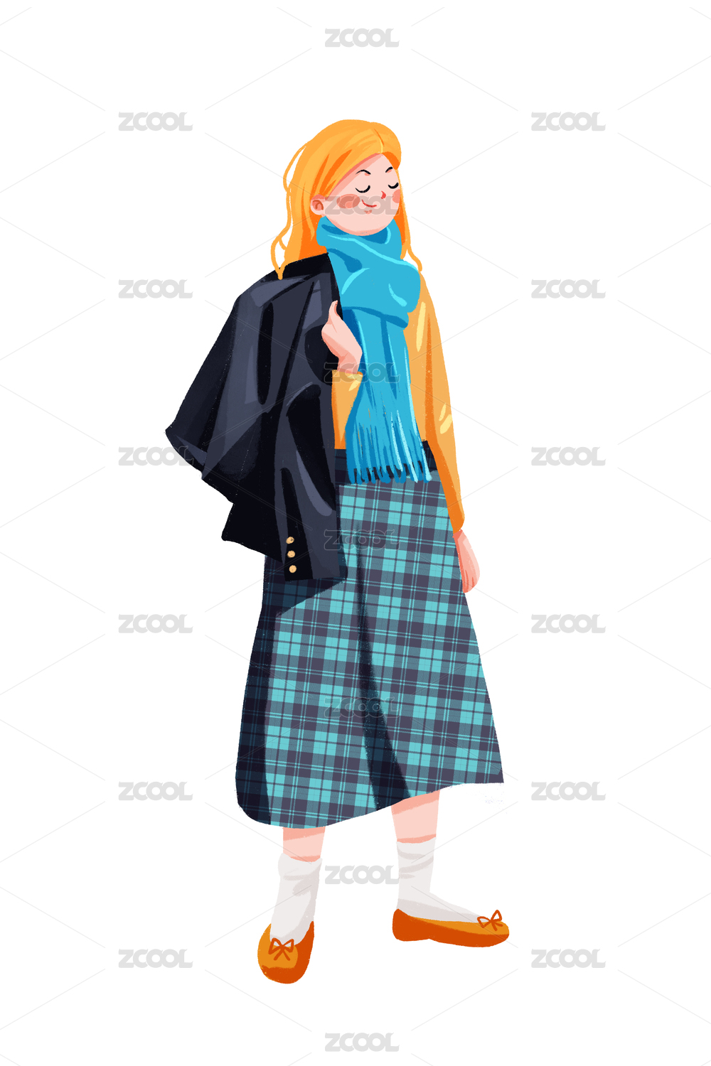 手拿鲜花和包的女孩穿着绿色针织衫深色裙子