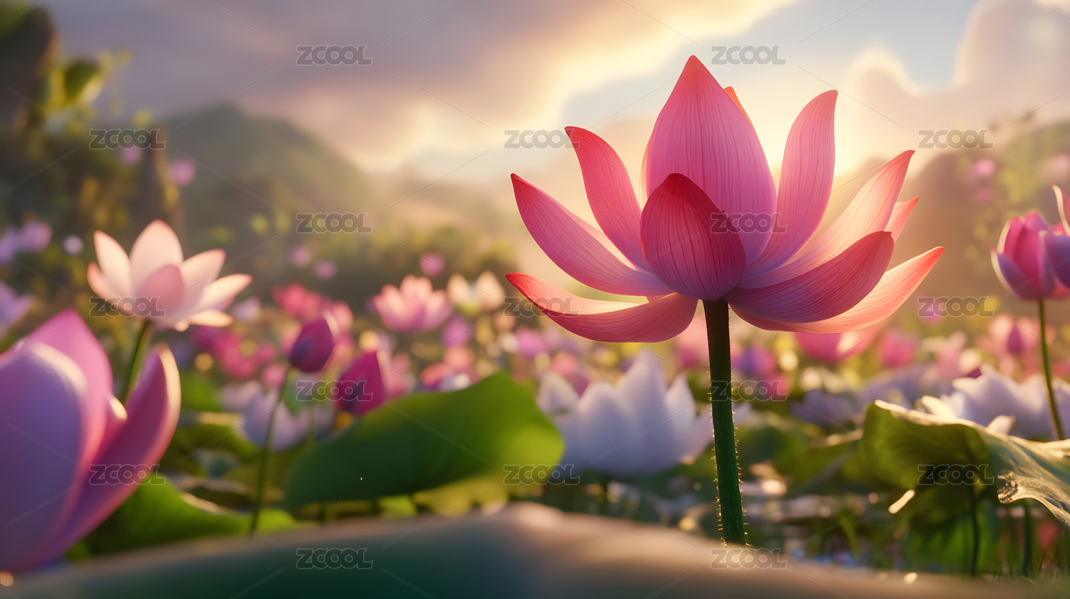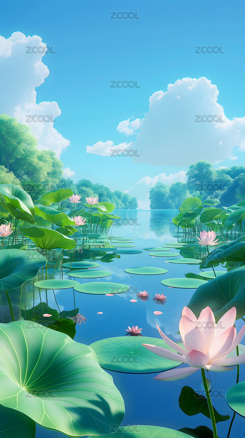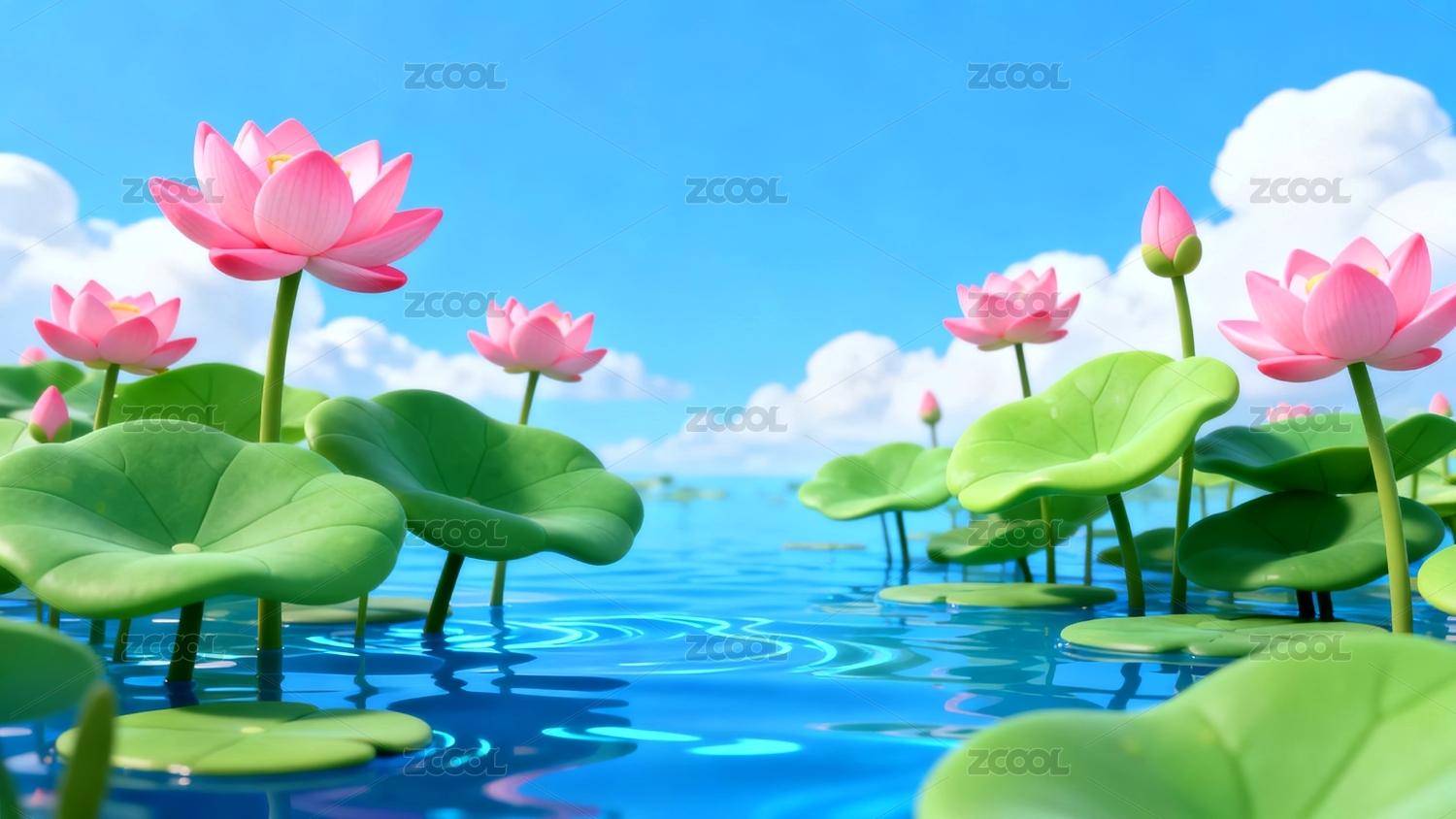 3d卡通夏天满荷叶荷花的池塘户外风景插画