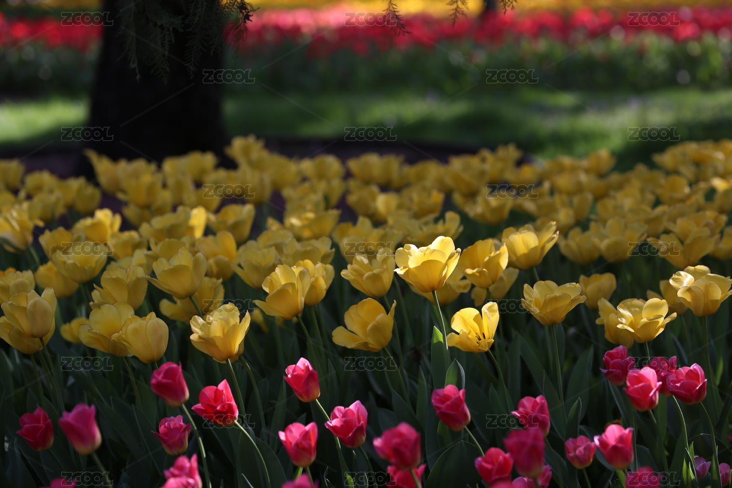 郁金香,水仙花,色彩鲜艳,整齐排列,阳光明媚。