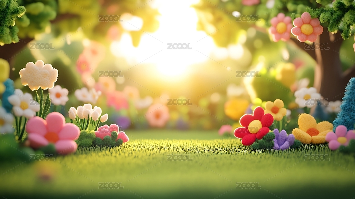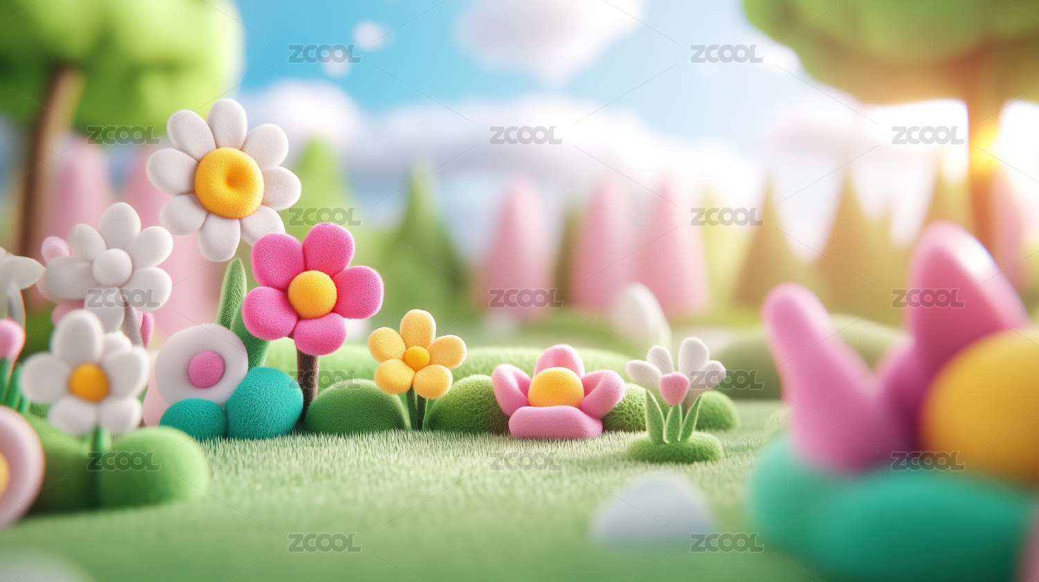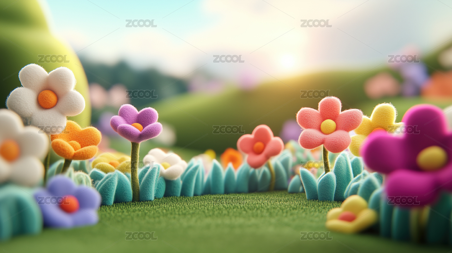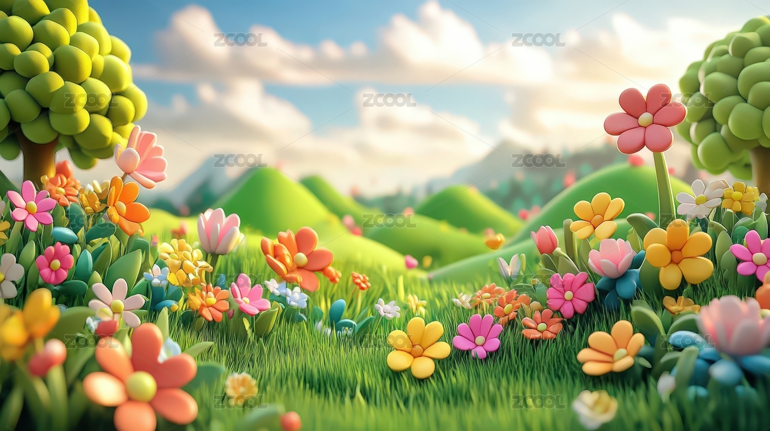 春天鲜花草地蓝天白云田园风光清新卡通背景