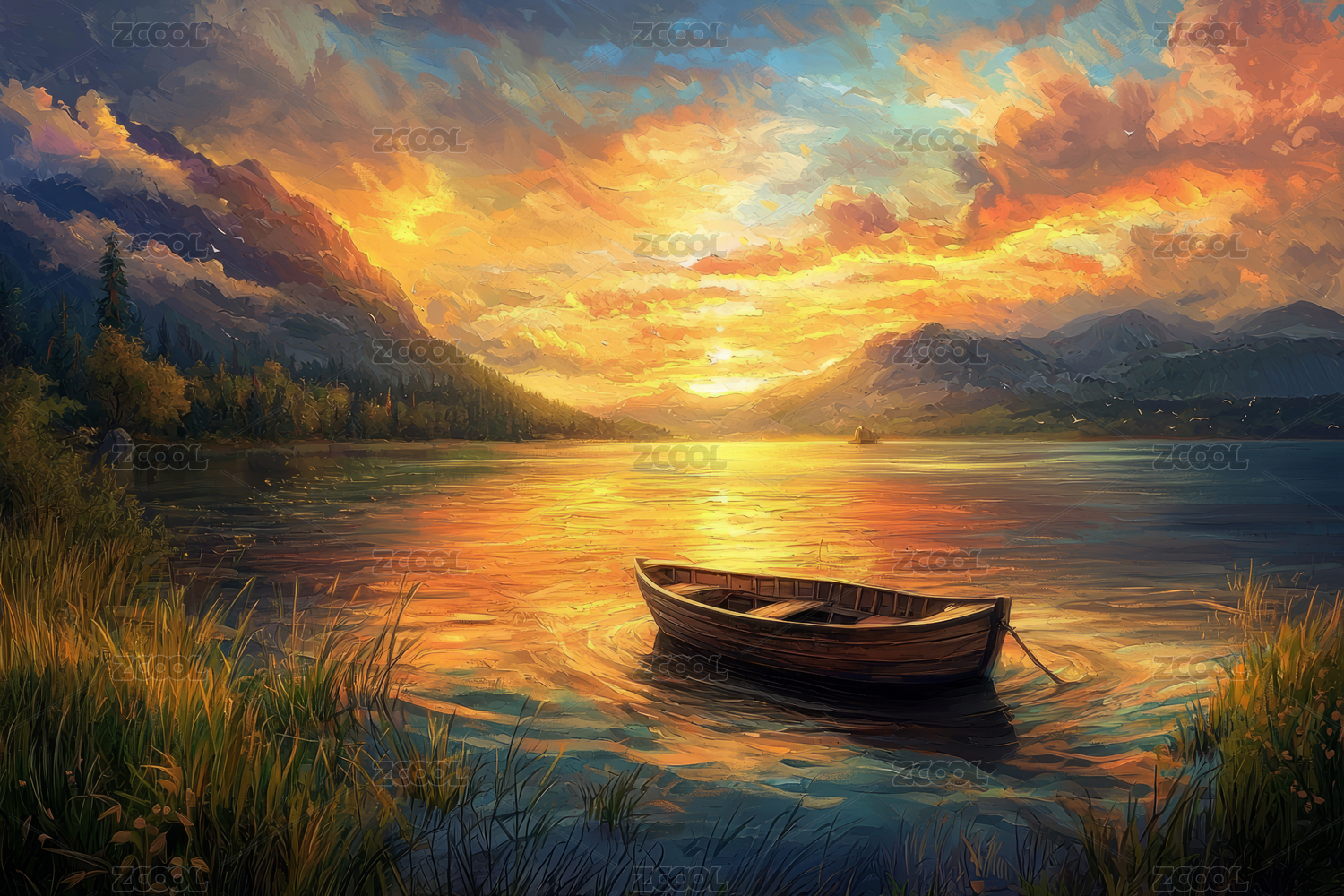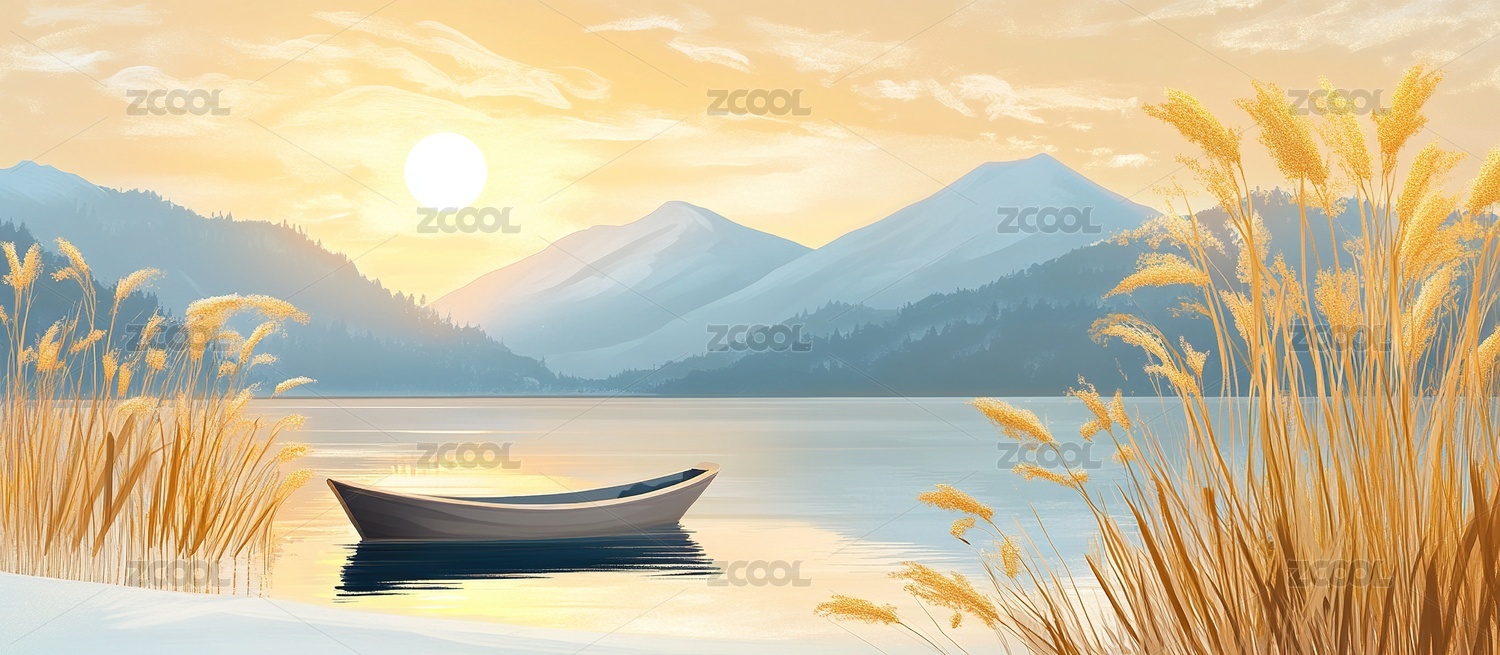 湖畔小船黄昏景