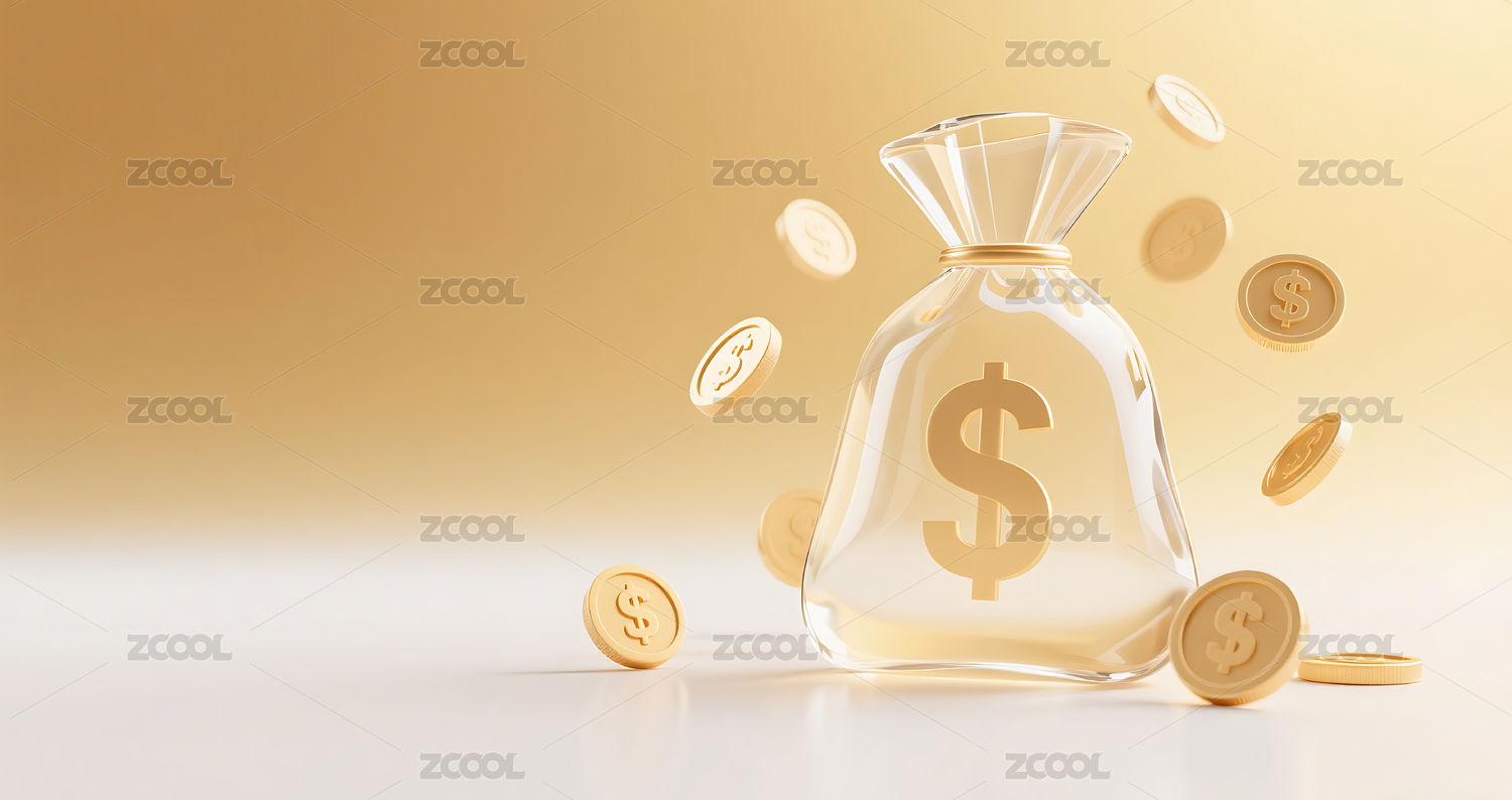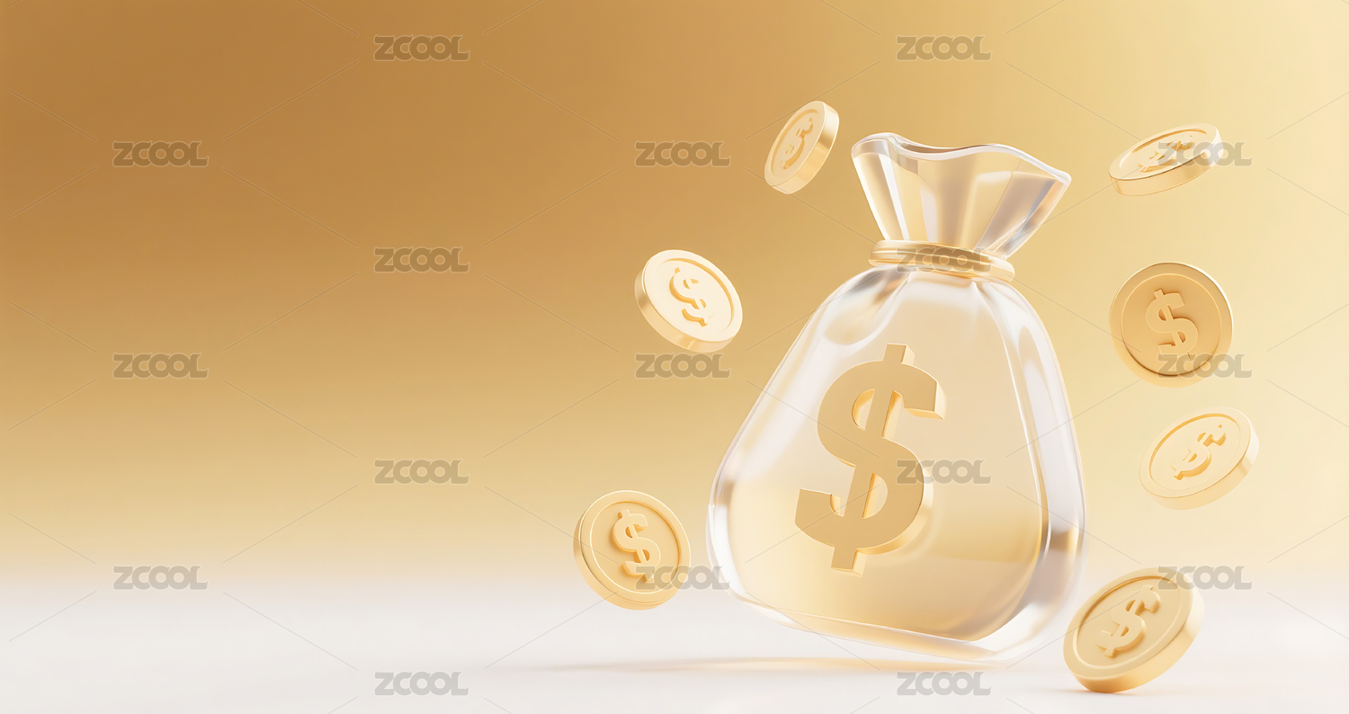 金色3D立体玻璃质感钱袋金币背景