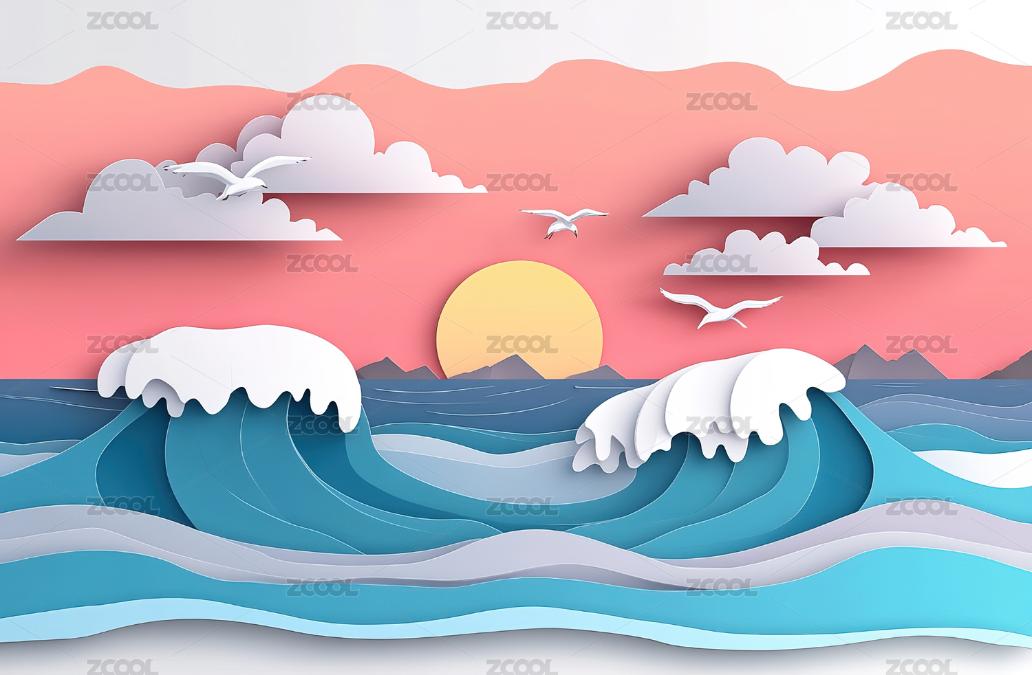 纸艺风格海浪日出景象