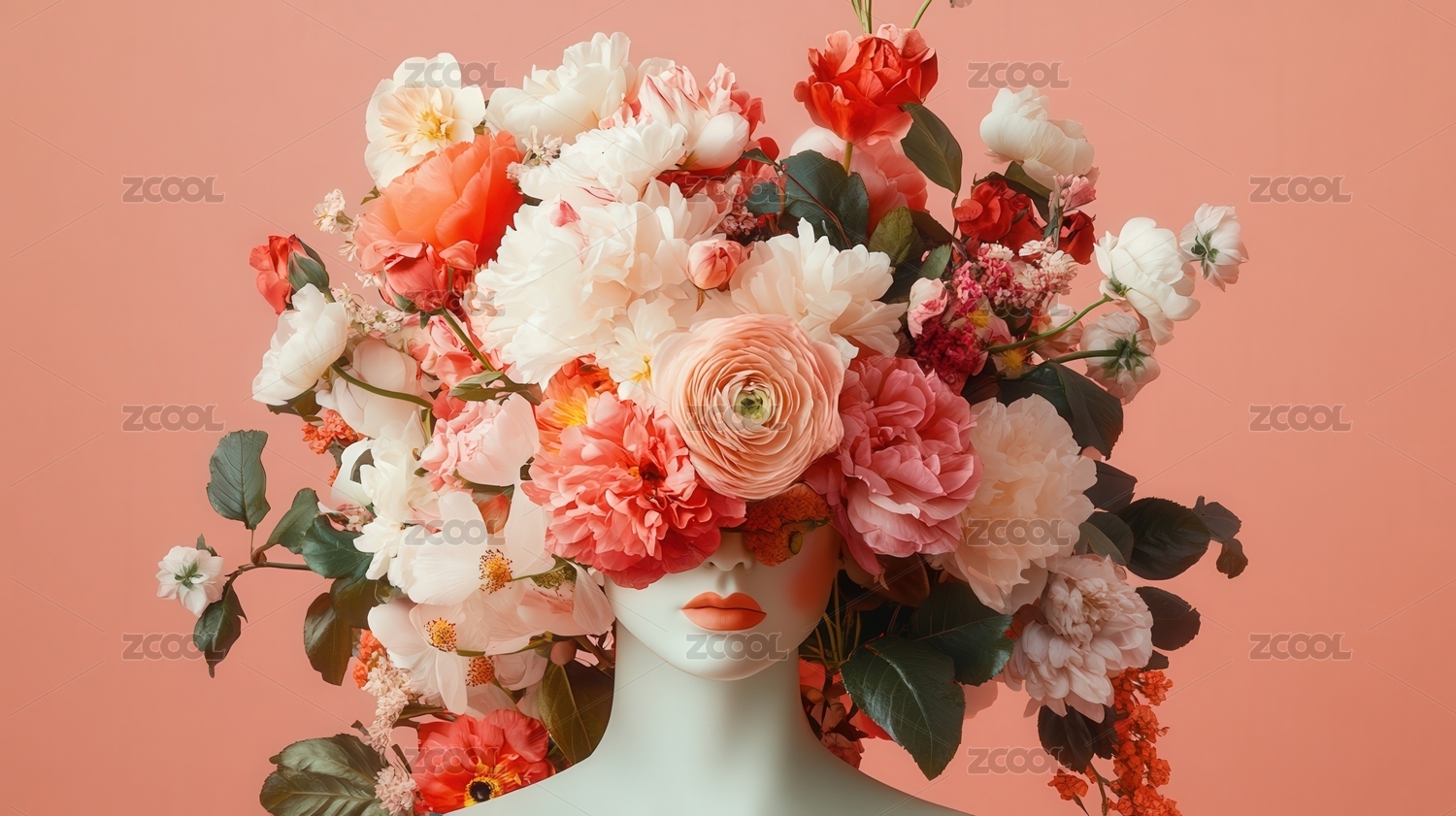 白色,人体,模型,头部,花环,花朵,苹果,香蕉,橙子,草莓