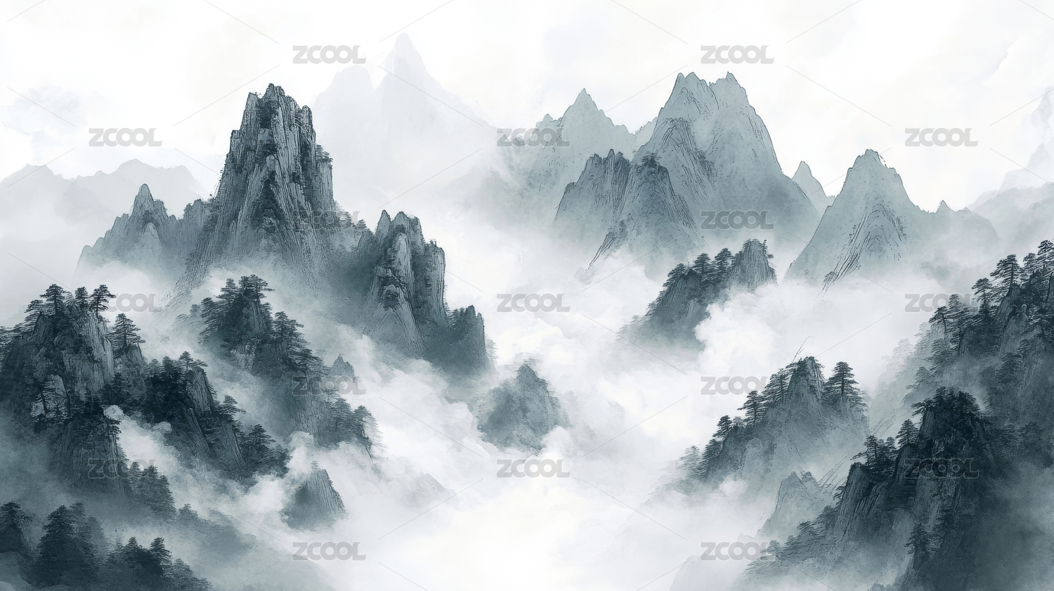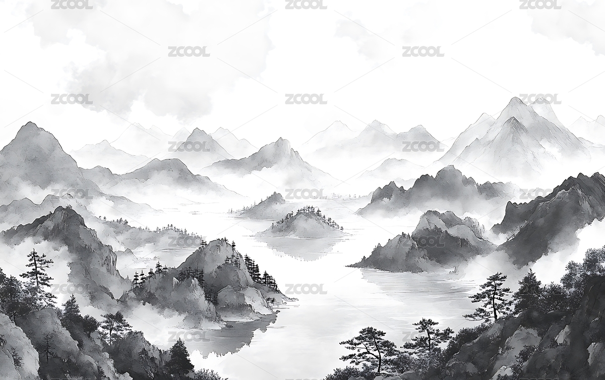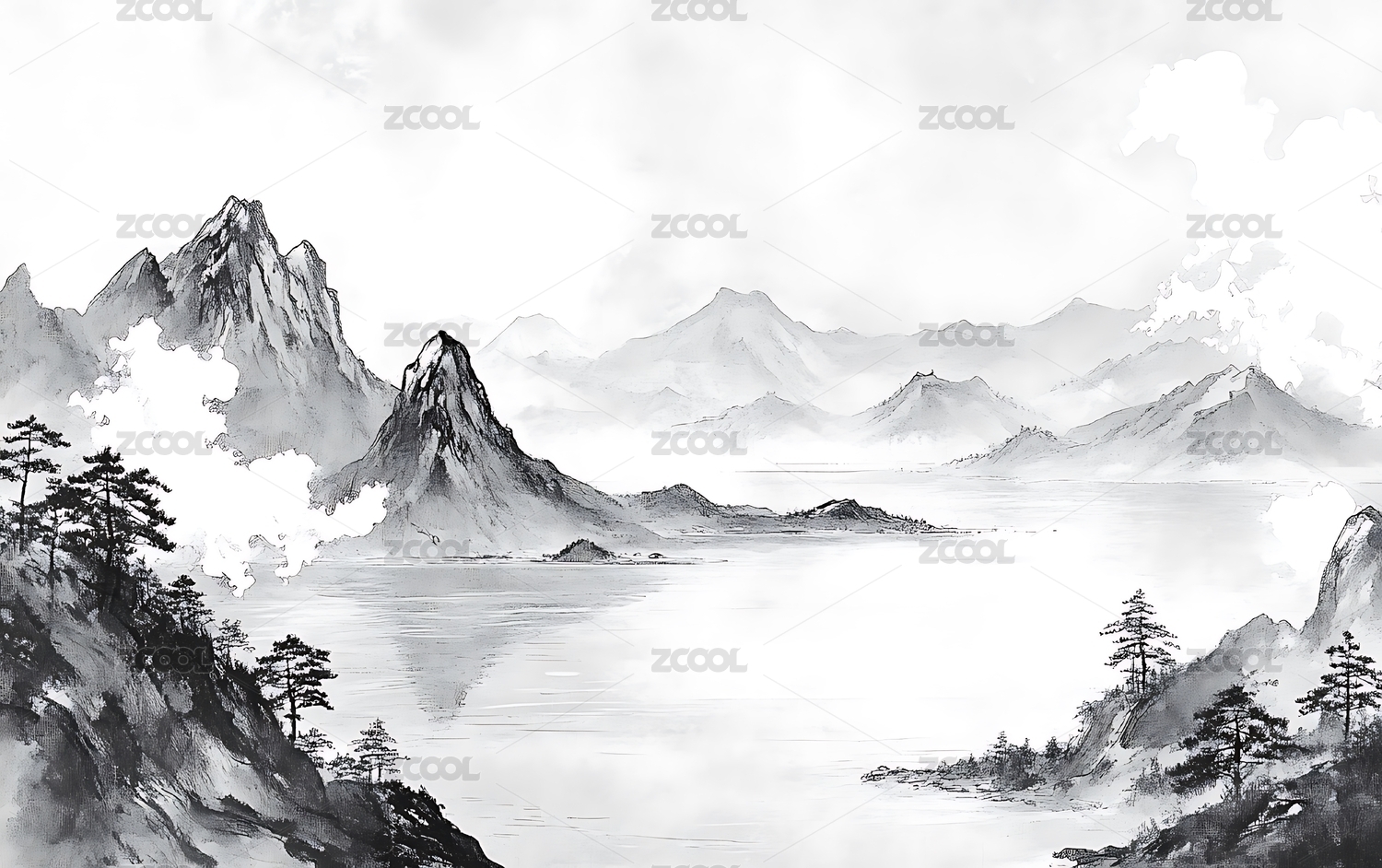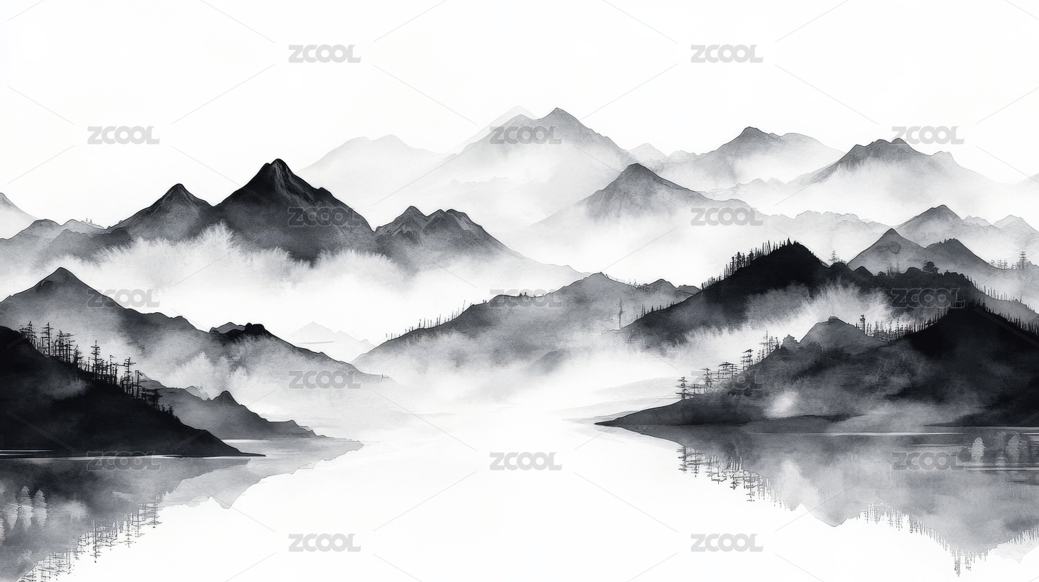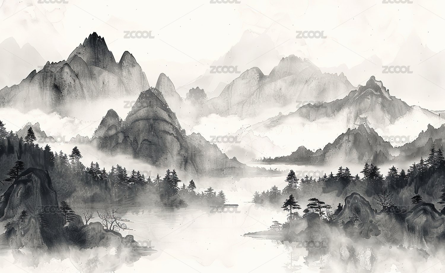 远山,树木,宁静,自然,水墨画,山水画,山峰,云雾,湖泊,松树