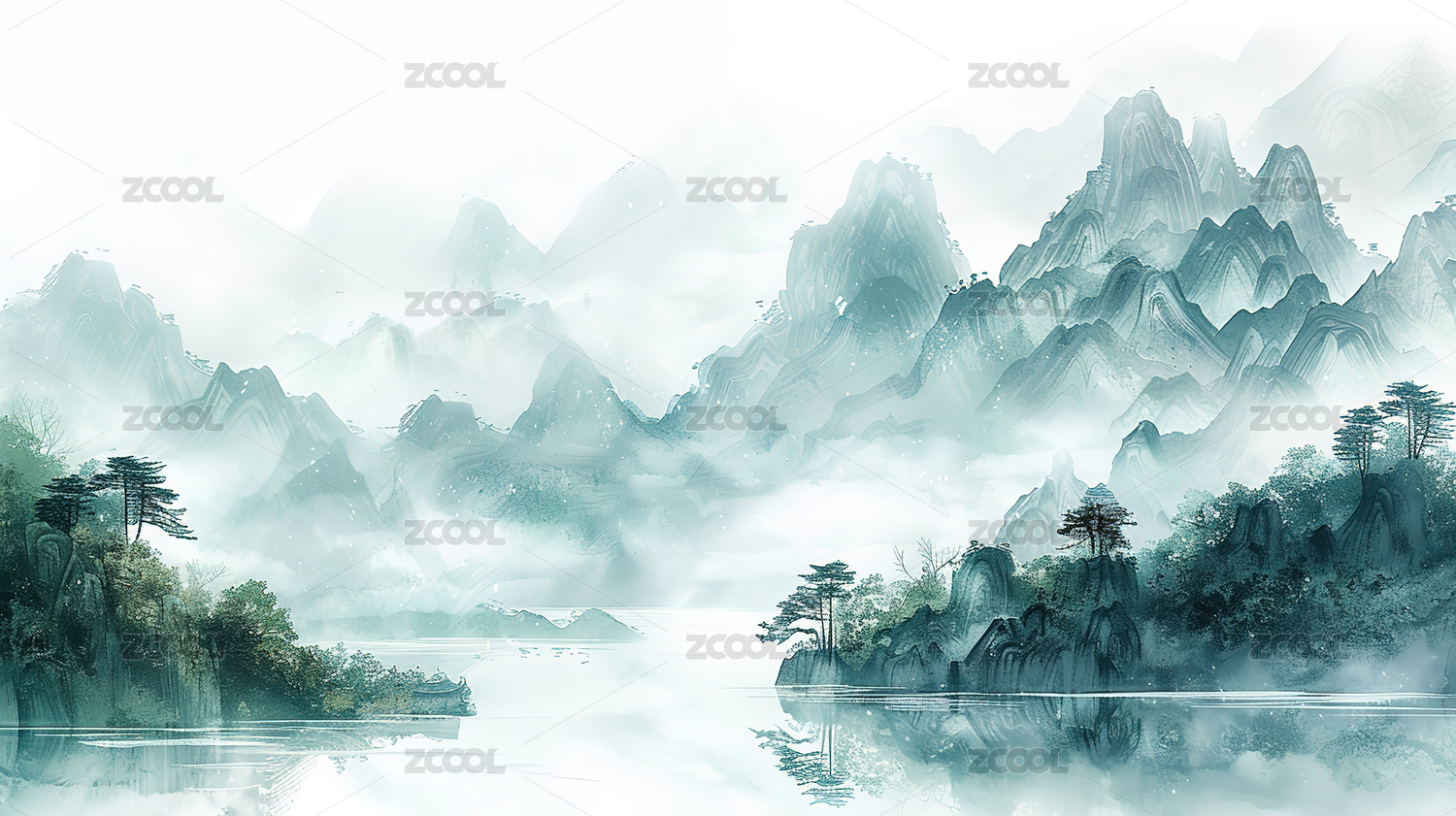 蓝色调的水墨风山水画,水墨风意境山水画概