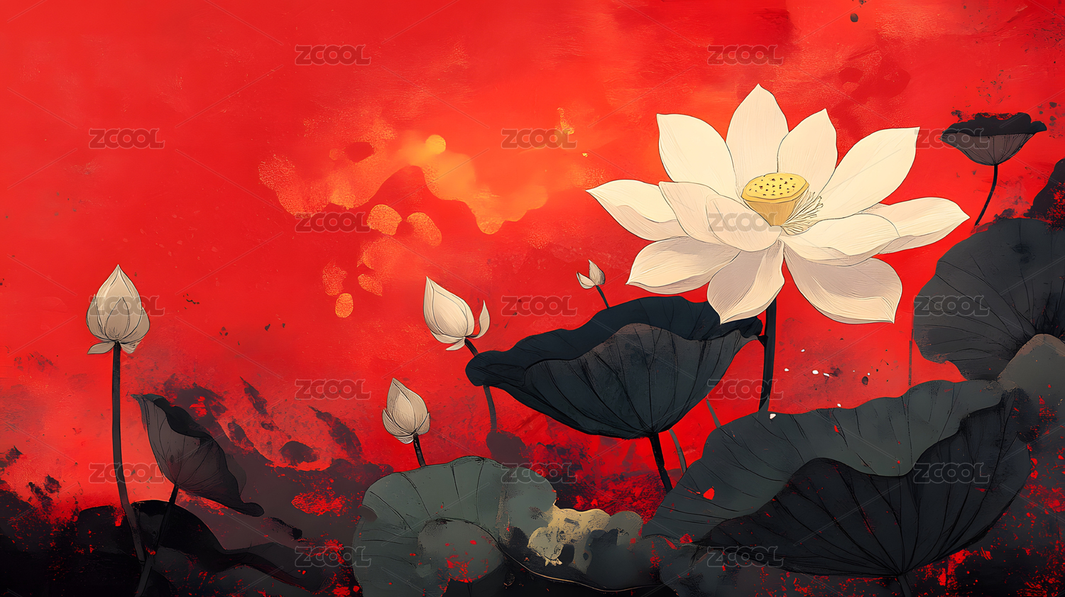 红底金饰绽放的优雅白莲花