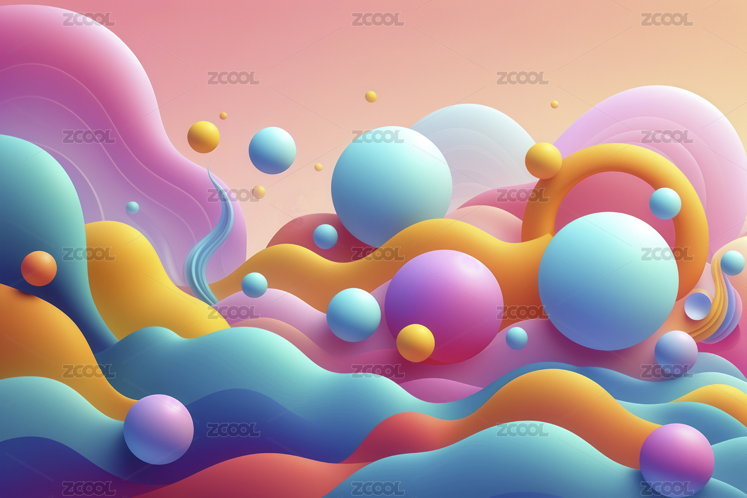 柔和粉蓝波浪与几何球体