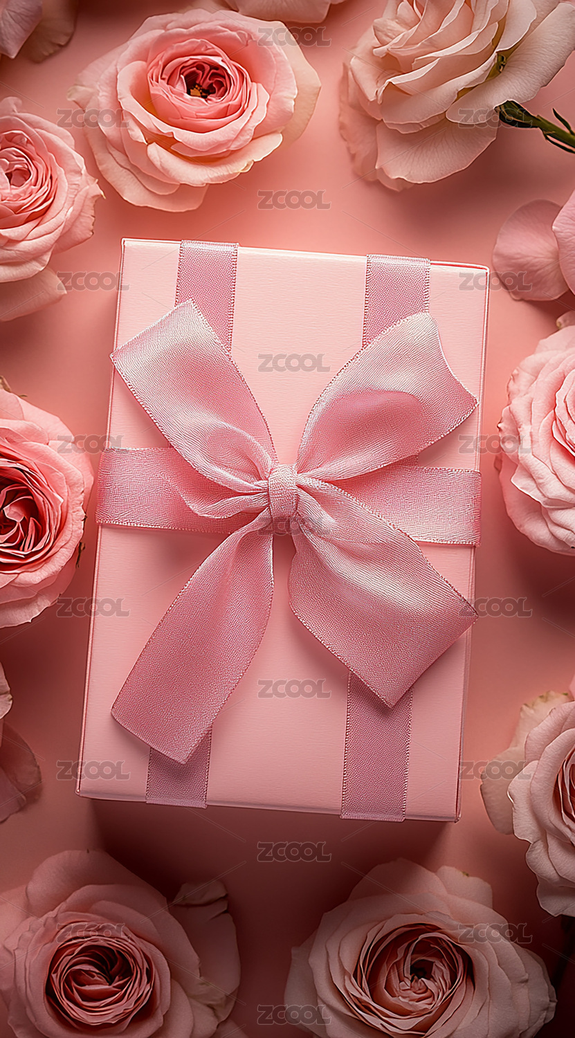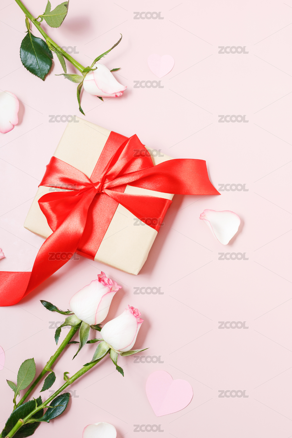 放在淡粉色背景上的玫瑰鲜花和礼物