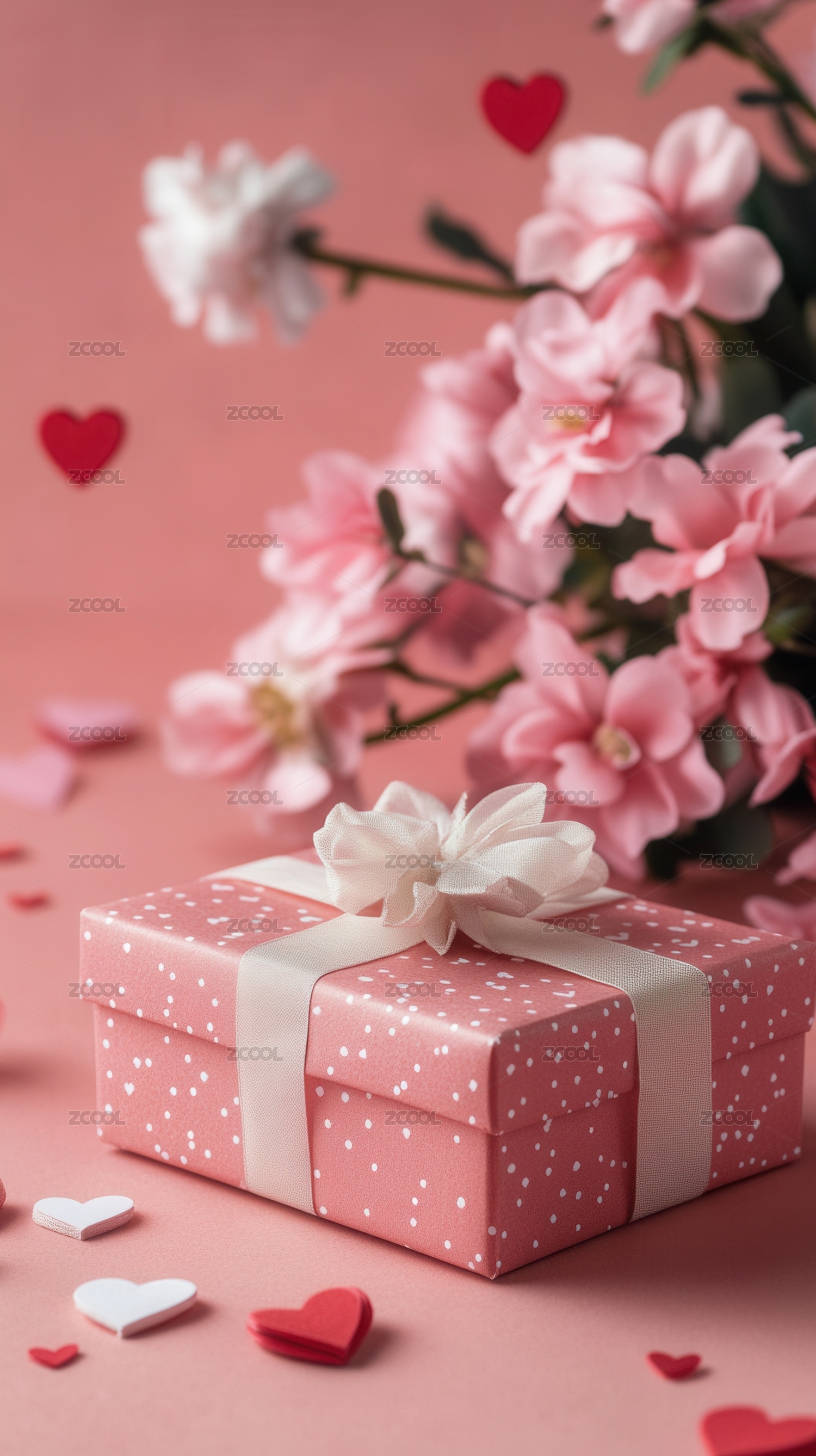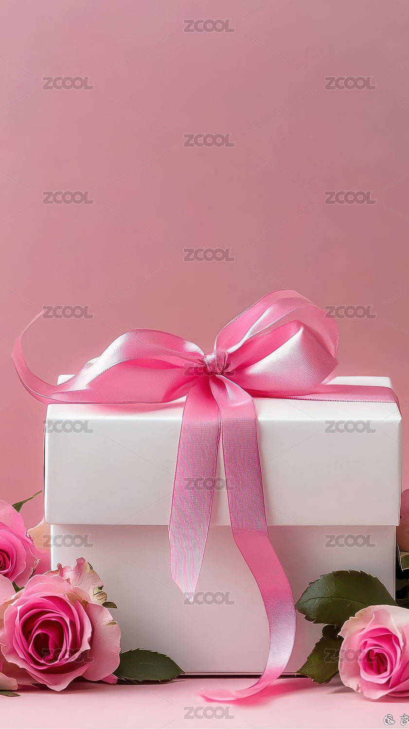 粉色留白背景上的爱心礼物盒和玫瑰花