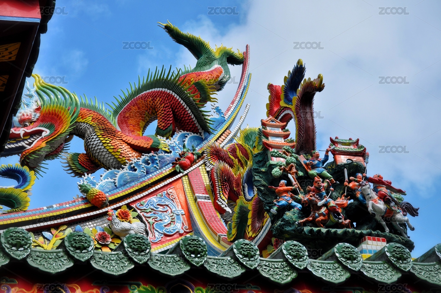 传统庙宇屋顶上的彩绘龙雕