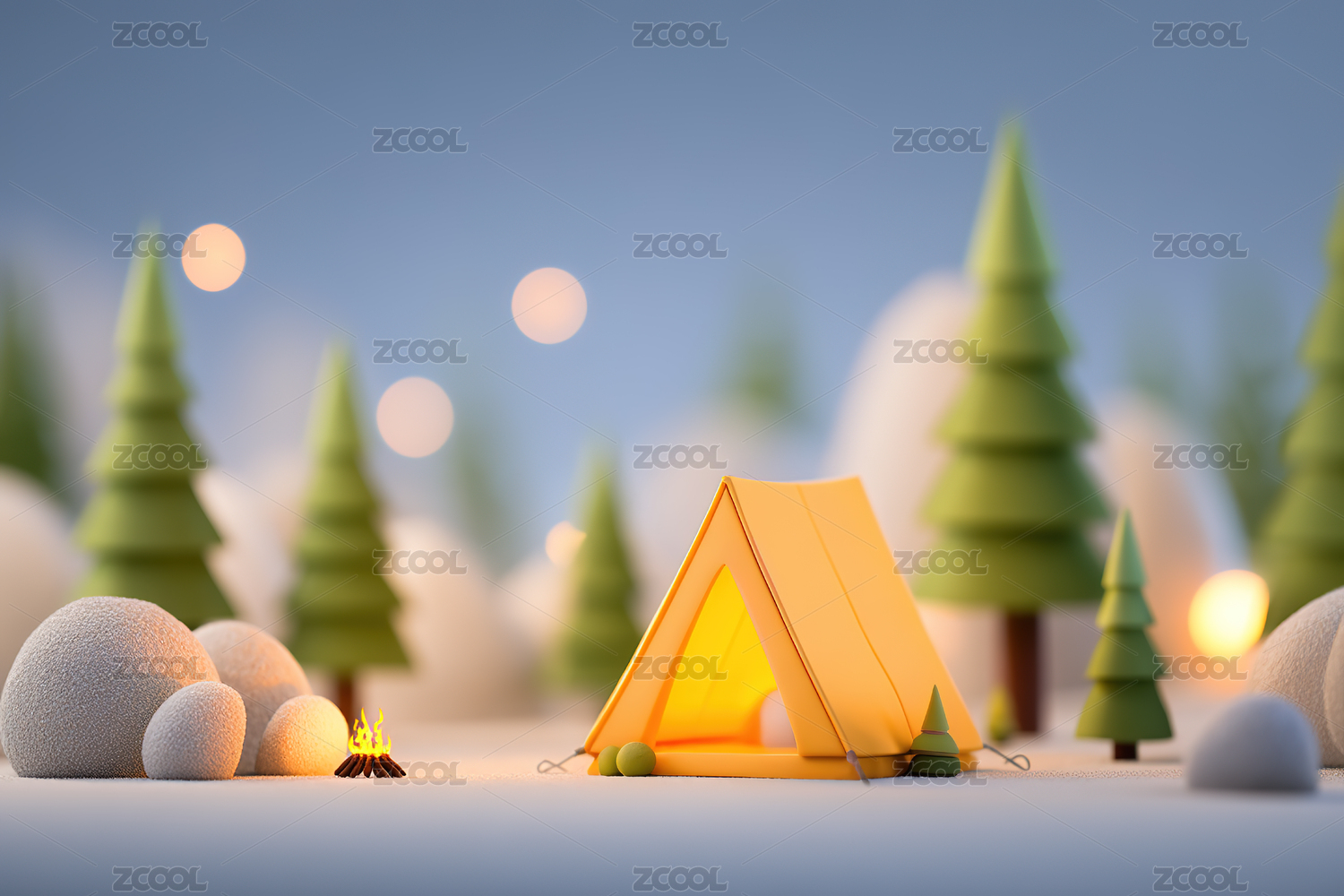 3D卡通冬天露营搭建帐篷场景