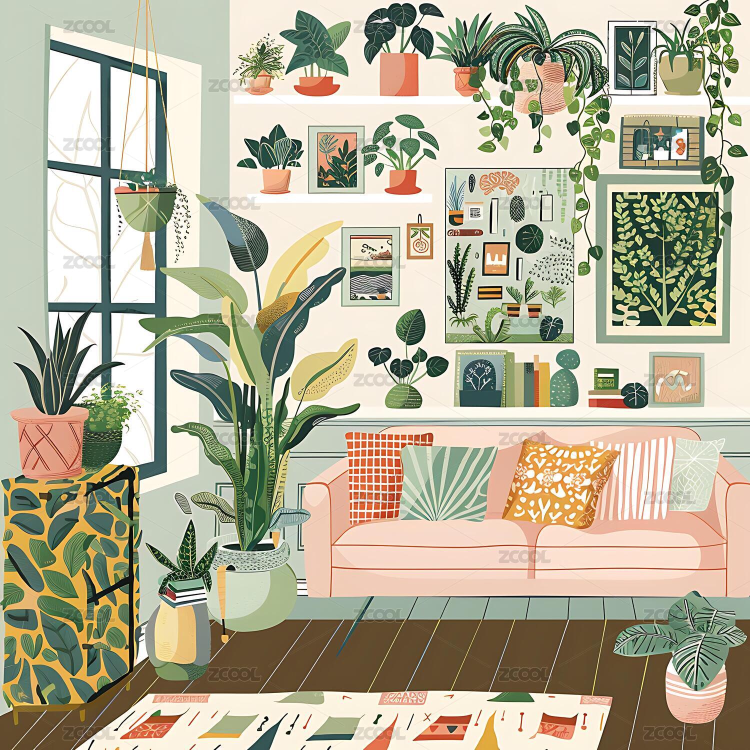充满绿植的客厅插画