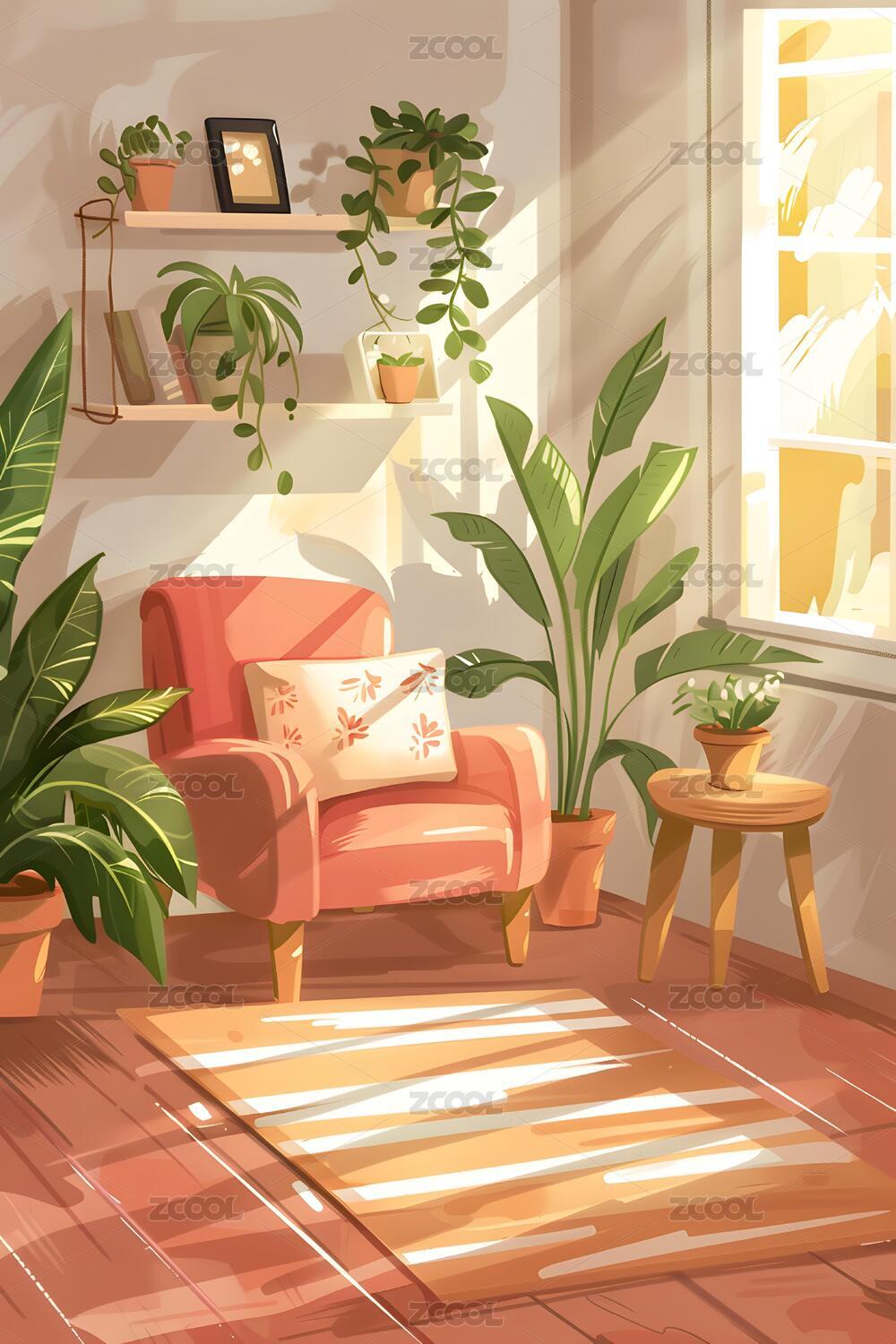 温馨插画风室内客厅场景