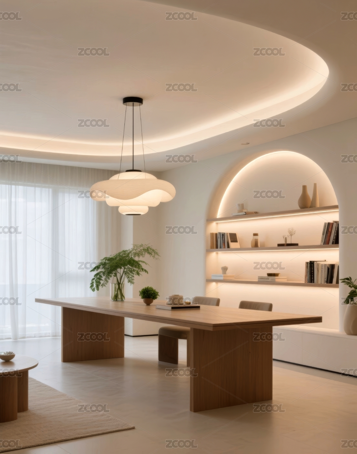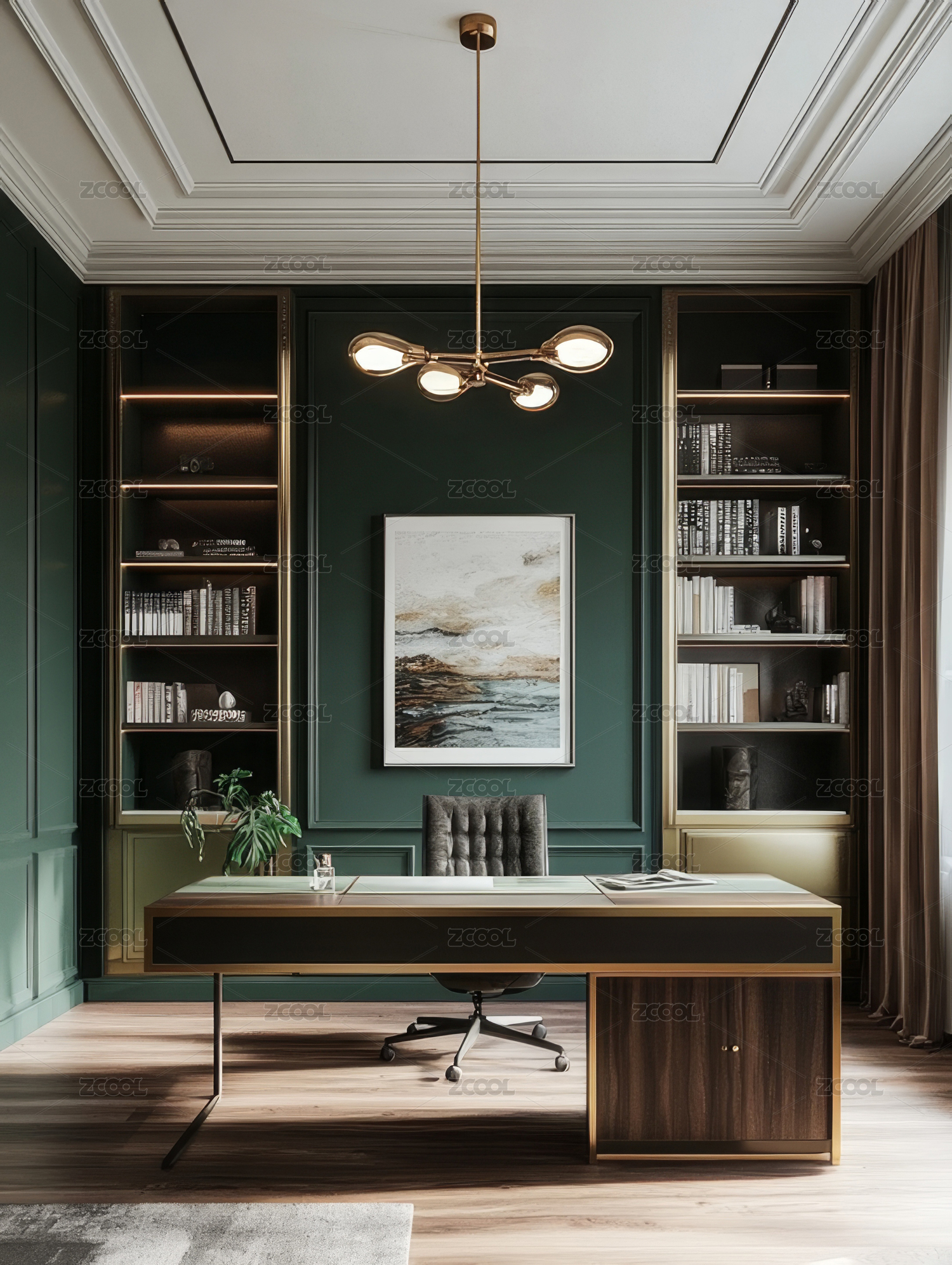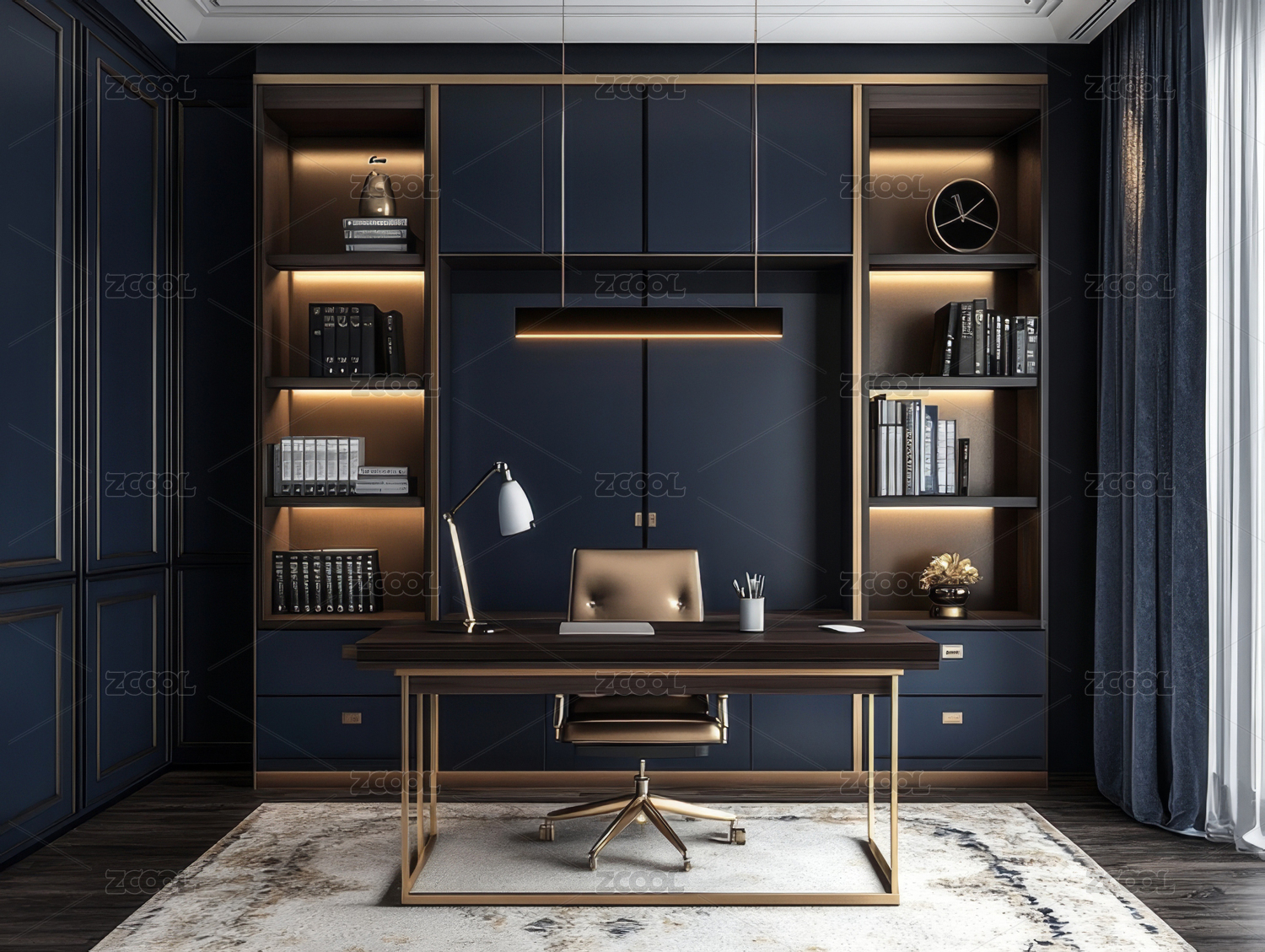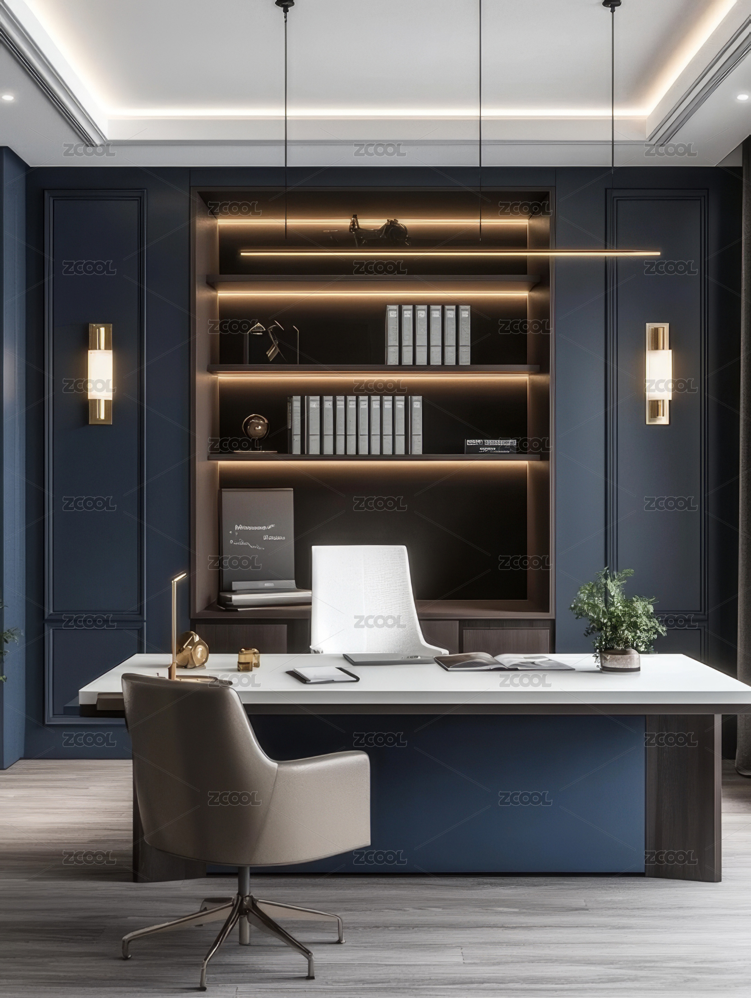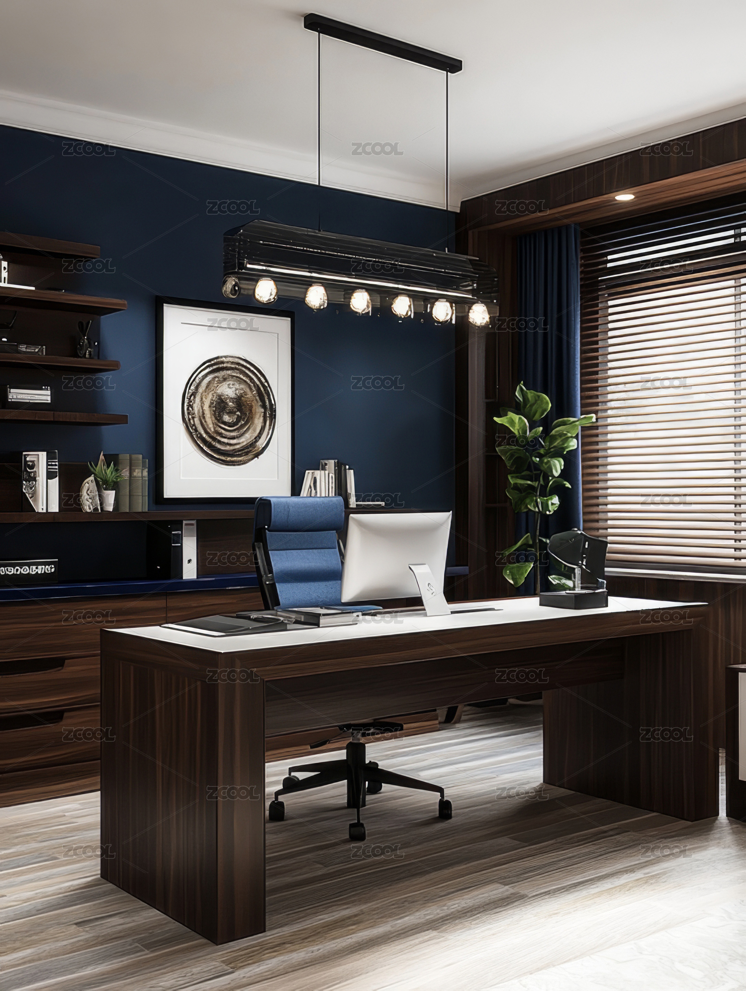 办公桌,椅子,书架,蓝色,墙壁,吊灯,植物,笔记本电脑,书籍,现代